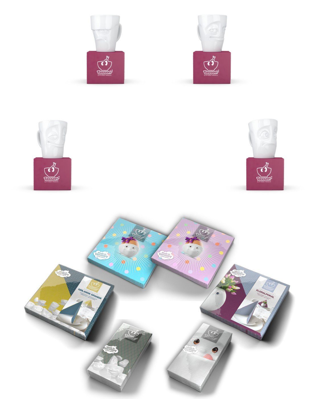 Set bestehend aus: 1 x Henkelbecher grummelig - Tassen by FIFTYEIGHT PRODUCTS 1 x Henkelbecher verschmitzt - Tassen by FIFTYEIGHT PRODUCTS 1 x Henkelbecher vergnügt - Tassen by FIFTYEIGHT PRODUCTS 1 x Henkelbecher verdutzt - Tassen by FIFTYEIGHT PRODUCTS 1 x Packung Servietten zufällige Auswahl (Nach Verfügbarkeit - Motiv nicht wählbar)