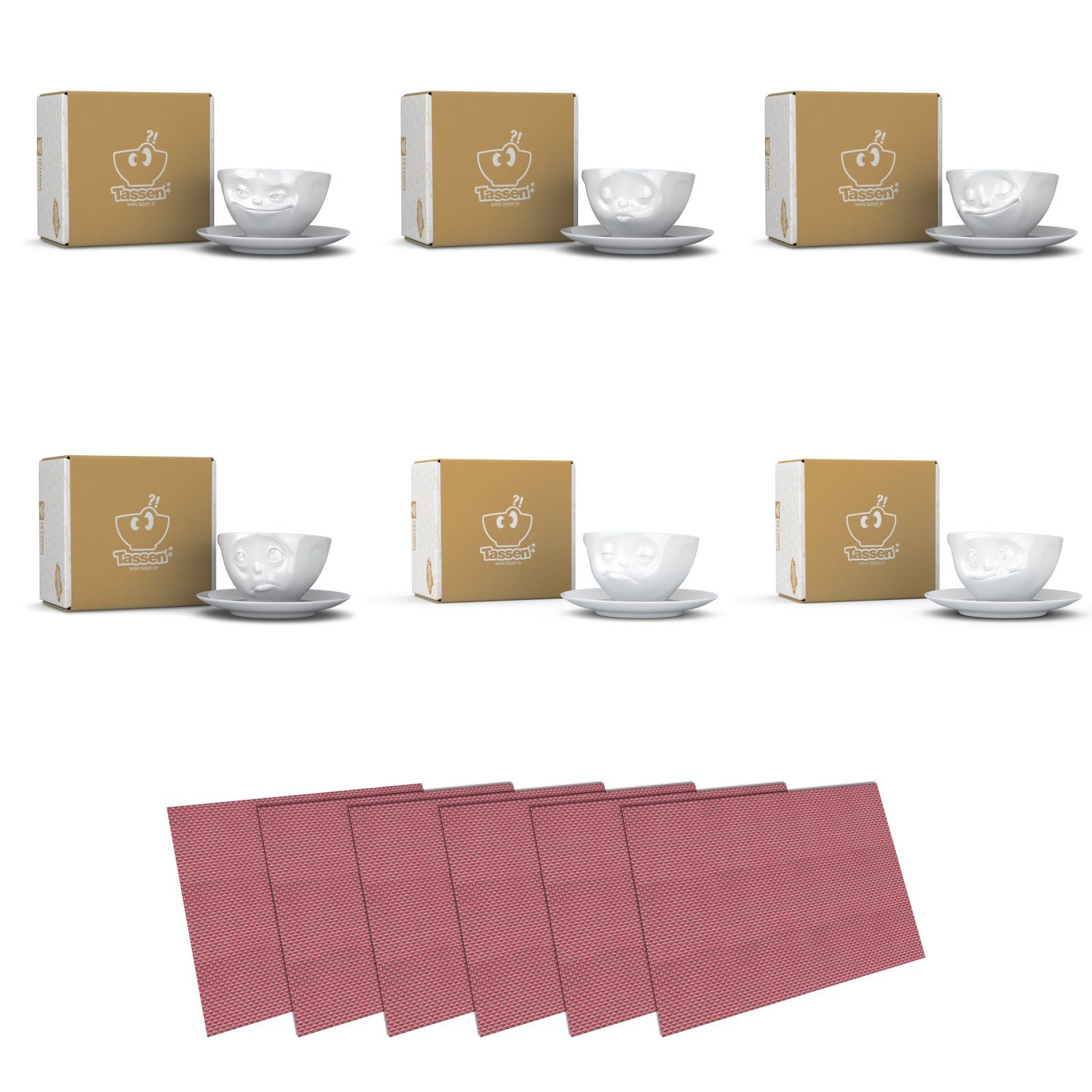 6 x Tasse by FIFTYEIGHT - glücklich + grinsend + och bitte + küssend + verpennt + lecker + Tischsets - Kaffeetassen 2-tlg. weiß