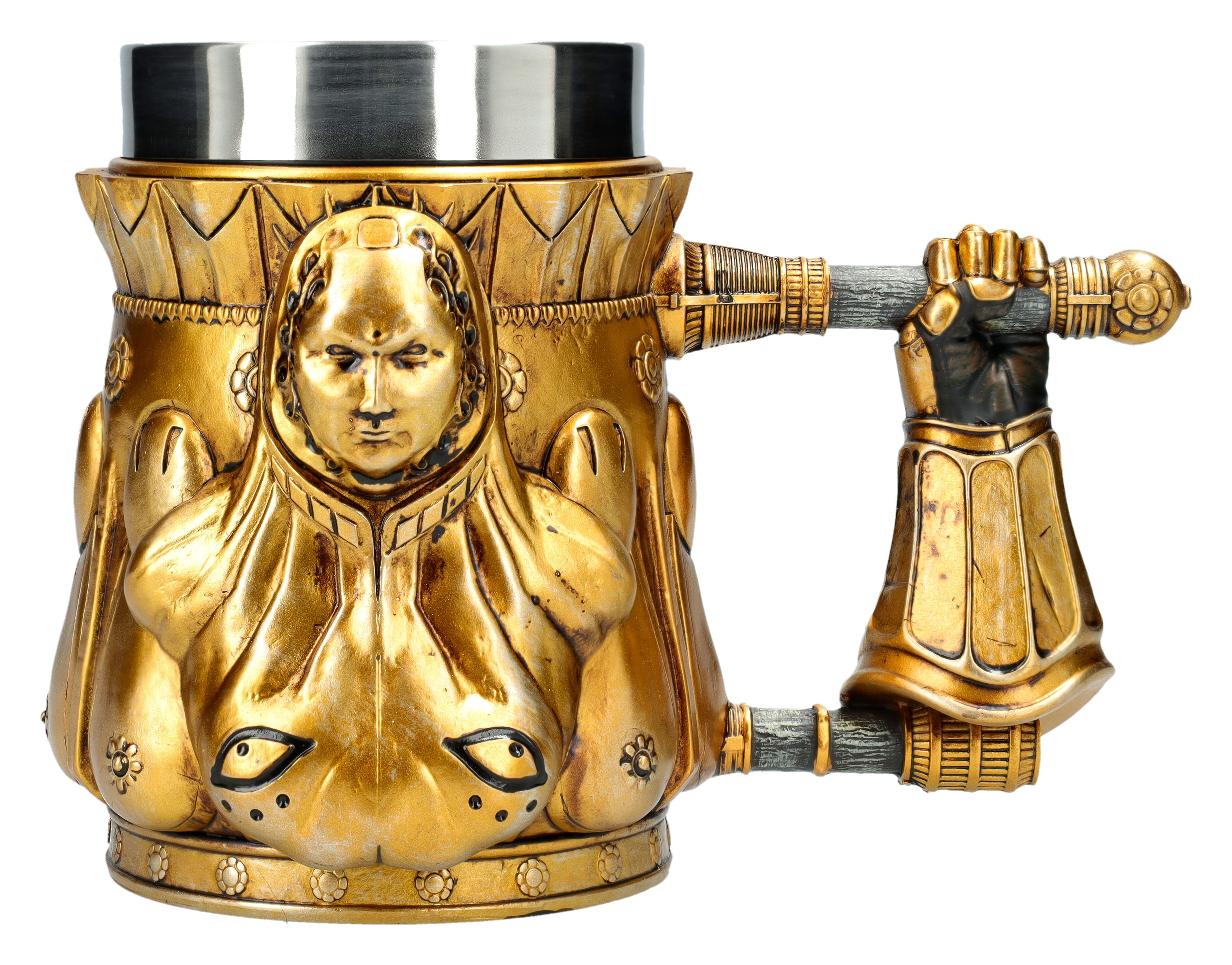 Mit seinen Maßen von 15 cm Höhe, 21.5 cm Breite (inkl. Henkel) und 14 cm Tiefe bietet der Krug ein Fassungsvermögen von 600 ml – perfekt für Met, Bier oder dein Lieblingsgetränk. Die handbemalte Oberfläche verleiht jeder Statue einen einzigartigen Look und macht ihn zum perfekten Sammlerstück für alle Dark Souls Liebhaber.