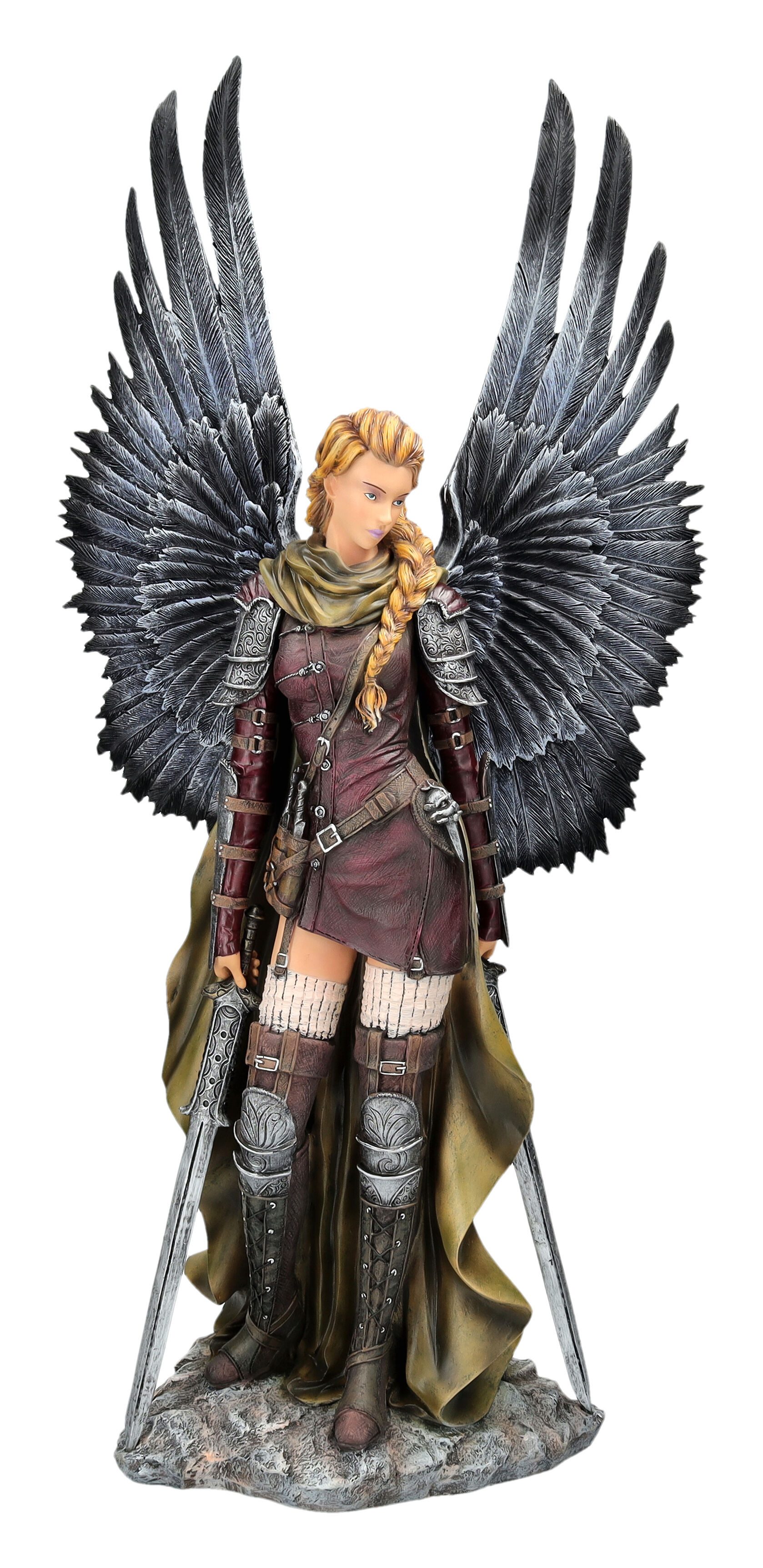 Diese imposante Schutzengel Kriegerin mit Schwertern gehört zu den himmlischen Streitkräften und verteidigt das Himmelreich. In beeindruckender Pose mit ausgebreiteten Flügeln und kunstvoll gestalteter Rüstung ist sie ein wahrer Blickfang. Die 69 cm hohe Engel Figur aus hochwertigem Polyresin wurde detailreich handbemalt. Ihre großen, steckbaren Flügel unterstreichen ihre majestätische Erscheinung. Perfekt als mystische Dekoration oder Sammlerstück für Engel- und Fantasy-Fans.