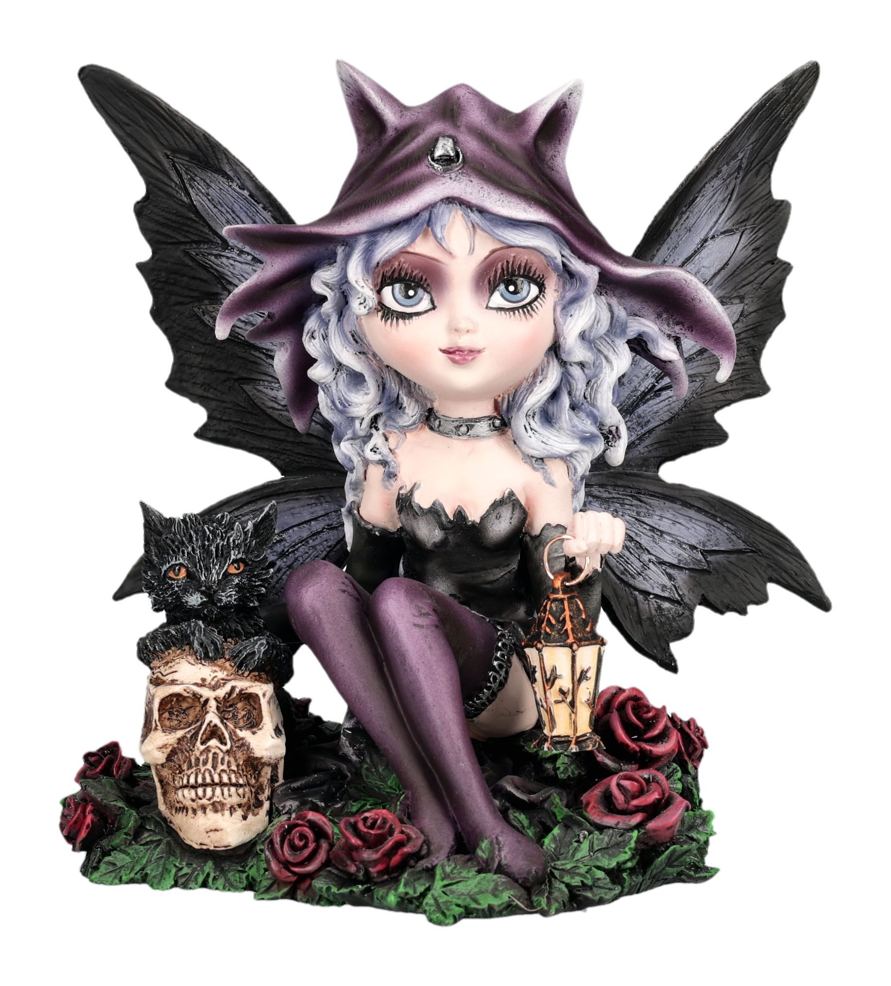 Zwischen Schatten und Rosen entfaltet sich die geheimnisvolle Aura der Midnight Fae Figur. Mit ausgebreiteten schwarzen Flügeln und violetten Strümpfen sitzt die Gothic-Elfe mitten in einem Beet aus dunkelroten Rosen. Ihre Pose ist verführerisch, ihr Blick durchdringend – ein echtes Highlight für jede Gothic- und Fantasy-Deko.