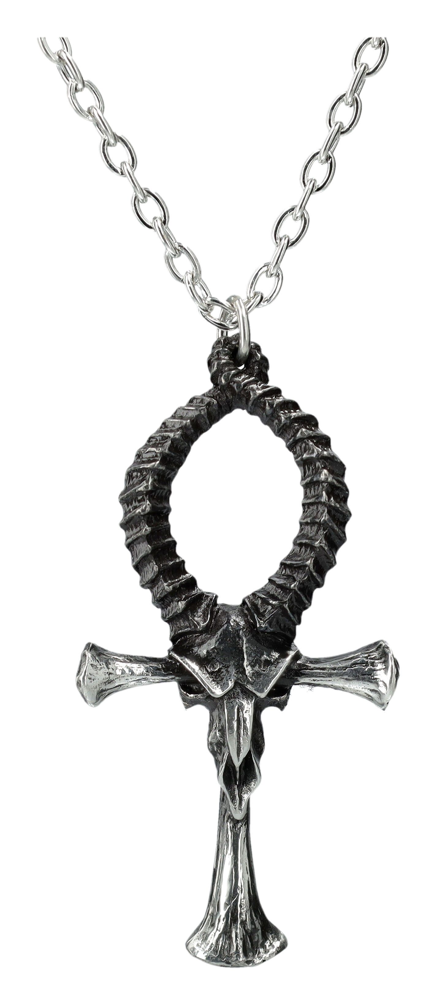 Das Design zeigt einen eindrucksvollen Widderschädel, aus dessen Augenhöhlen gedrehte Hörner hervorragen und sich zu einem stilisierten Ankh-Kreuz formen – ein Symbol für Leben und spirituelle Kraft. Die geschwärzten Akzente verleihen dem Schmuckstück eine düstere, mystische Aura, die perfekt zu Gothic- und Fantasy-Stilen passt.