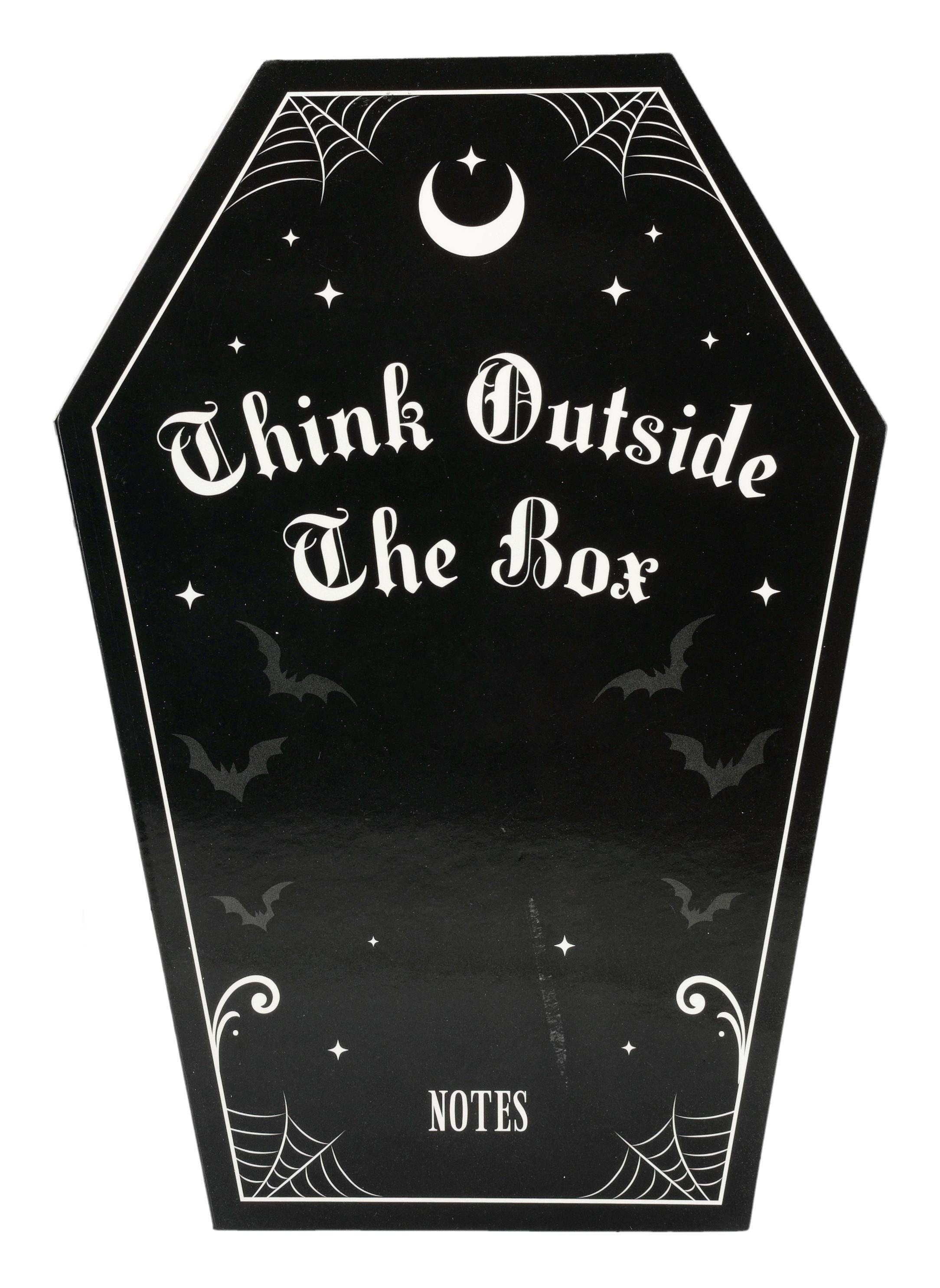 Dieses schwarze Notizbuch in markanter Sargform ist ein echtes Highlight für alle Gothic-Fans und Liebhaber außergewöhnlicher Papeterie. Verziert mit mystischen Motiven wie Spinnweben, Fledermäusen, Sternen und einer Mondsichel, bietet es Raum für düstere Gedanken, kreative Ideen und geheime Notizen.
