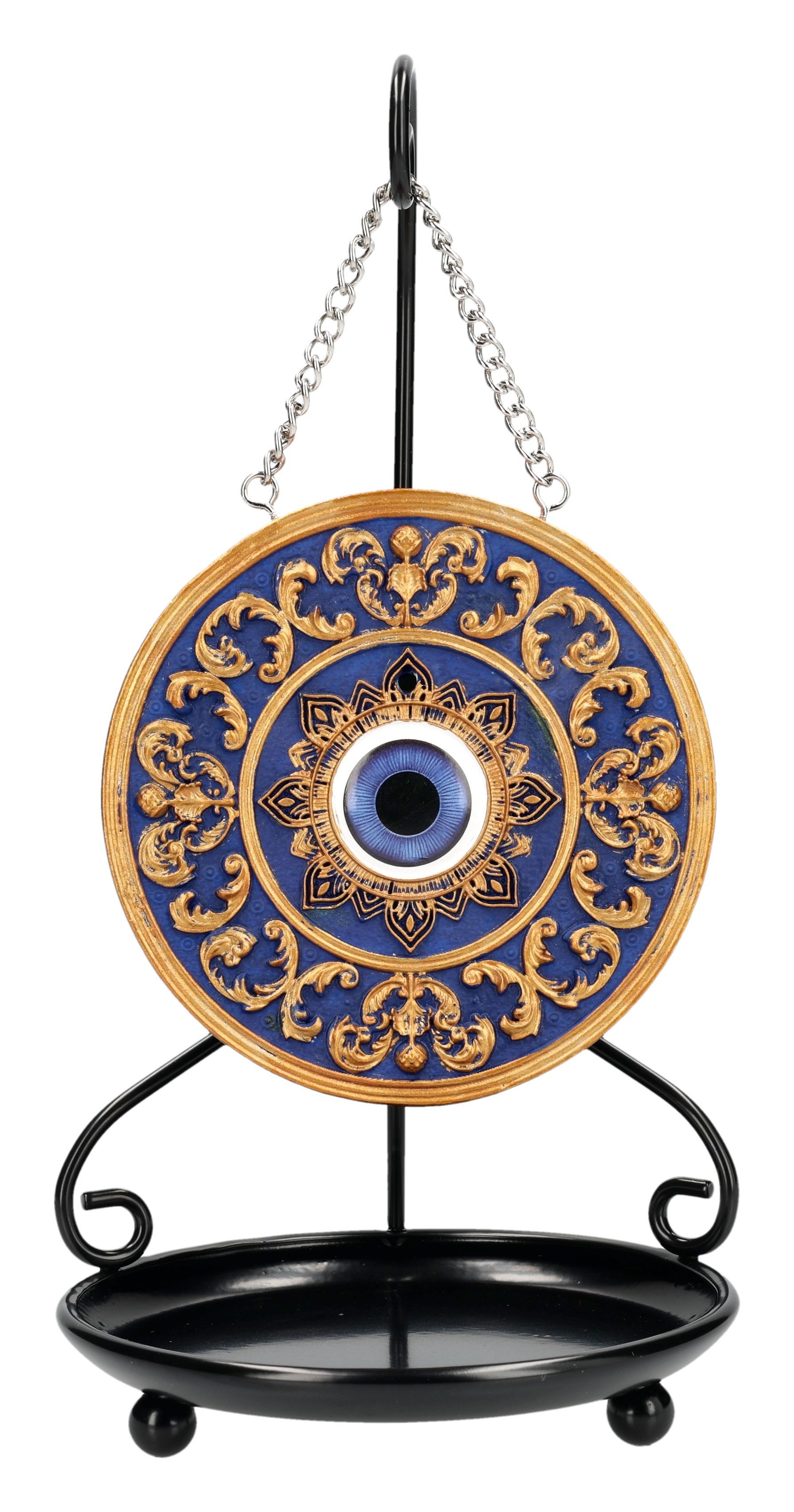Die kunstvoll verzierte Scheibe mit dem Evil Eye Symbol besitzt einen Durchmesser von 11 cm und wird an einem stabilen Metallständer präsentiert. Hergestellt aus handbemaltem Polyresin überzeugt die Figur durch Detailreichtum und Robustheit. Mit einer Gesamthöhe von 24,5 cm, einer Breite von 12,5 cm und einer Tiefe von 12,5 cm bietet der Halter eine eindrucksvolle Präsenz, ohne dabei zu wuchtig zu wirken. Das Gewicht von ca. 0,36 kg sorgt für sicheren Stand.