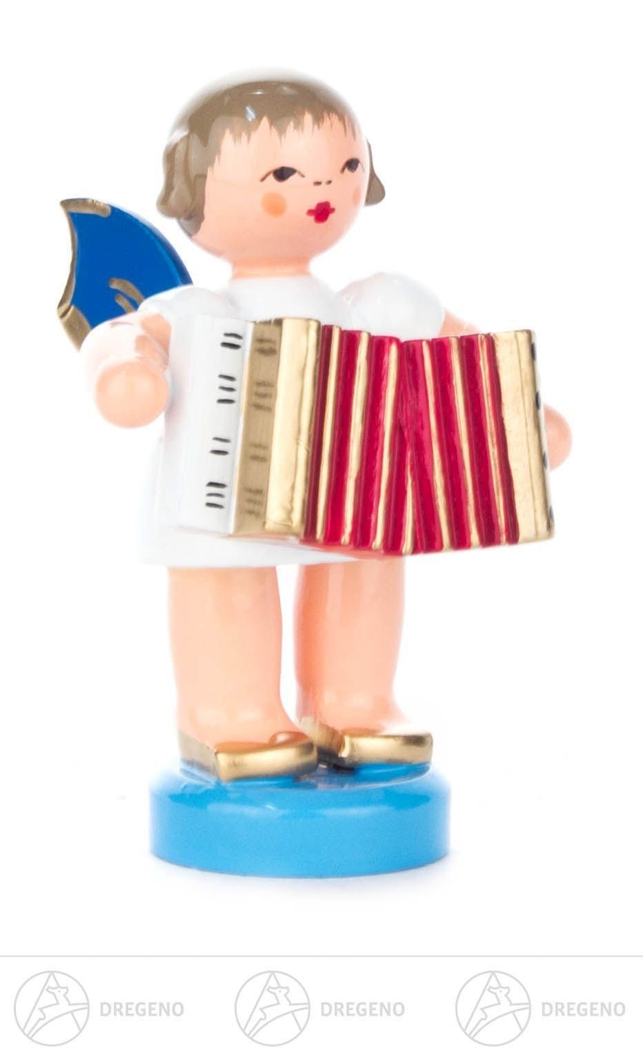 Dregeno Erzgebirge Engelfigur Engel mit Akkordeon stehend, blaue Flügel Höhe ca 5,5 cm NEU