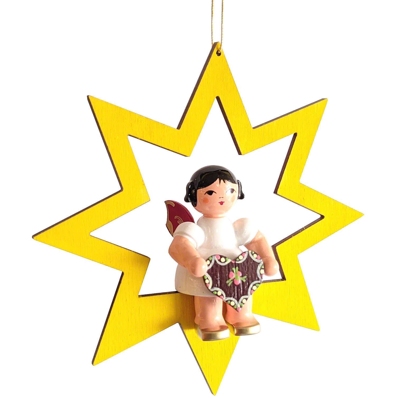 Figurenland Uhlig GmbH Dekohänger Engel mit Lebkuchenherz - Rote Flügel - sitzend im Stern gelb (10,5cm)