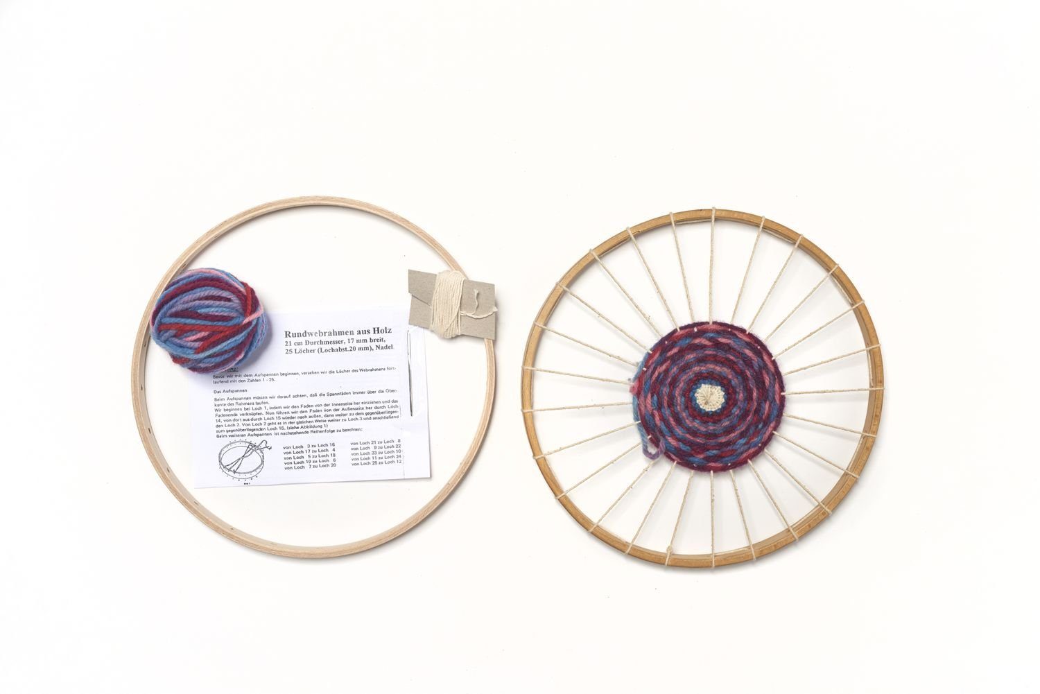 Ein Rundwebrahmen aus Holz für Kinder. Mit 25 Löchern, inkl. Nadel und Wolle.