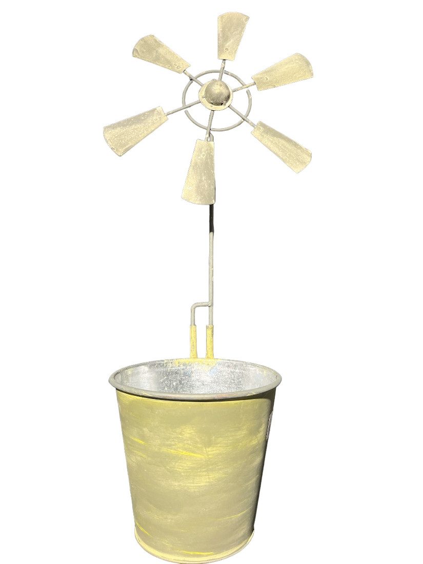 Metalleimer mit Windmühle die sich auch im Wind dreht, geeignet als Pflanztopf, Übertopf, Blumentopf