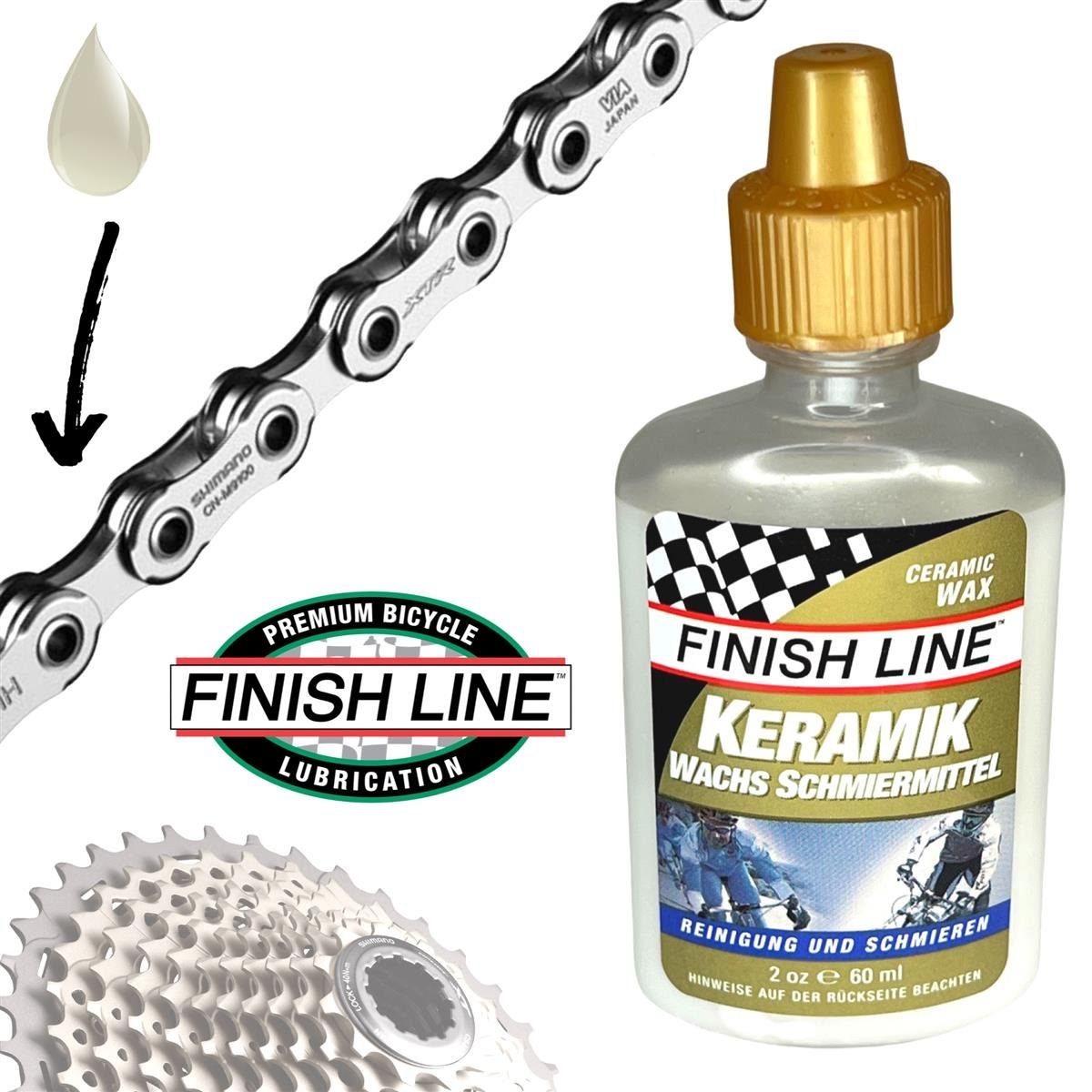 Das Premium-Synthetik Wachsschmiermittel mit patentierter Keramik-Technologie aus Boron Nitriden in Nano-Размер ist Finish Line's fortschrittlichste Technologie. Das Schmiermittel bildet eine trockene nässe- und schmutzabweisende Wachs-Keramikschicht, die Reibung reduziert, Abnutzung minimiert und besonders langanhaltend ist. Mehrmaliges Auftragen verbessert diese Wirkung. Besonders geeignet für den Langzeiteinsatz unter trockenen und staubigen Bedingungen.