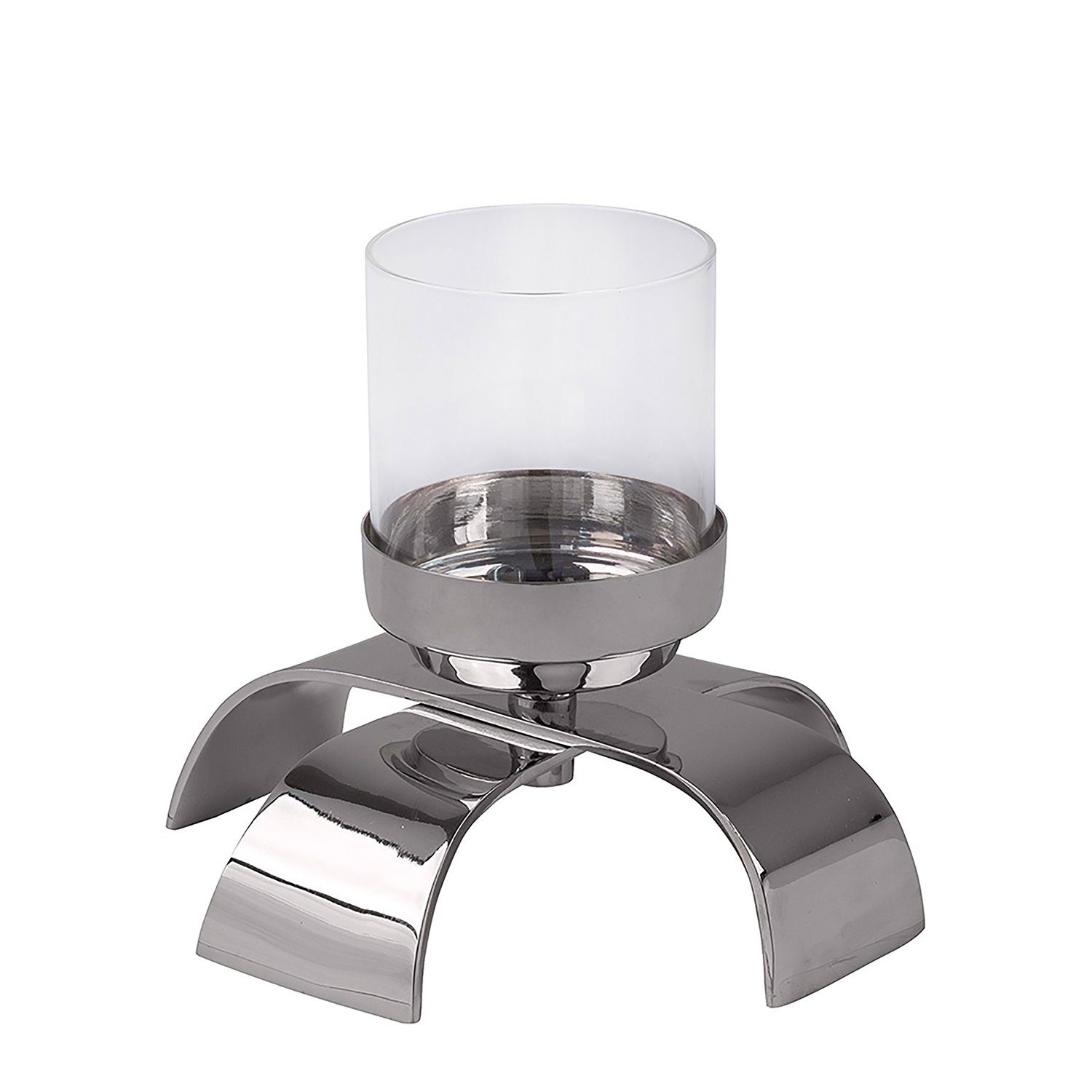 Der FINK AARON Kerzenleuchter besticht durch seine silberfarbene, glatte Oberfläche und ist ideal als Tischleuchter für stilvolle Deko im Wohnzimmer geeignet.