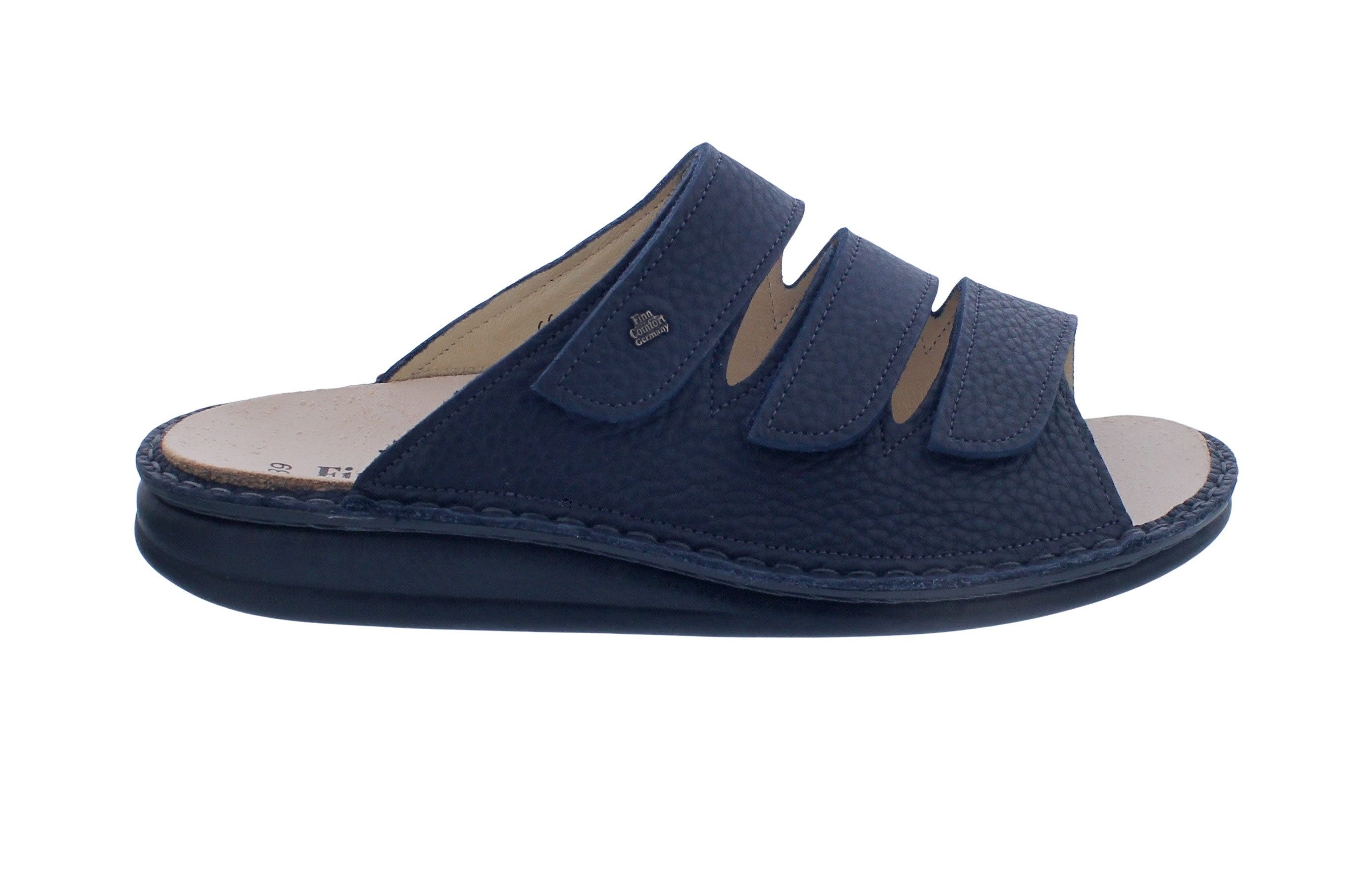 Finn Comfort Pantolette Korfu 1508-813098 in Navy (dunkelblau) Rabo - genarbtes Glattleder: Seit fast 75 Jahren entwickelt Finn Comfort® zusammen mit Podologen und Orthopädie-Schuhmachern das bekannte Finn Comfort® Qualitäts-Schuhwerk. So bietet Ihnen der absolute Finn Comfort® Klassiker Korfu nicht nur einen angenehmen Tragekomfort, sondern auch durch die Naturform - kräftiger Fuß und die drei Klettverschlüsse eine optimale Passform. Das herausnehmbare Superbequem -Bett aus einer formstabilen Kork-Latex-Mischung unterstützt den Mittelfuß im Längs- und Quergewölbe und ist besonders fußschonend durch das pflanzlich gegerbte Leder. Die handvernähte PU - Laufsohle mit mittlerer Sprengung 12mm ist äußerst flexibel und gelenkschonend.