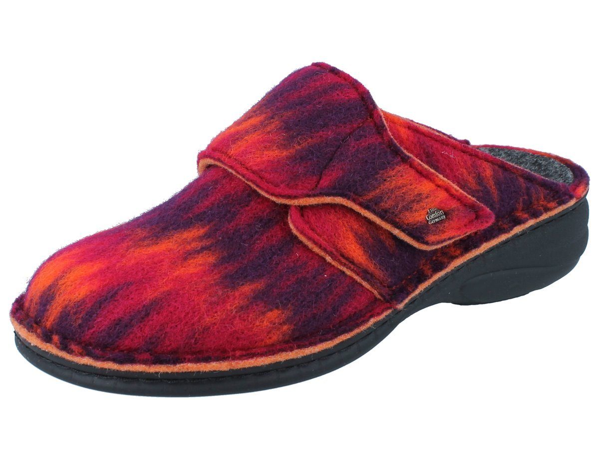 Dieser warme Damenclog aus Filz mit den geflammten Rottönen ist ein trendiges Herbstmodell. Die Musterung kann sich bei beiden Schuhen etwas unterscheiden.