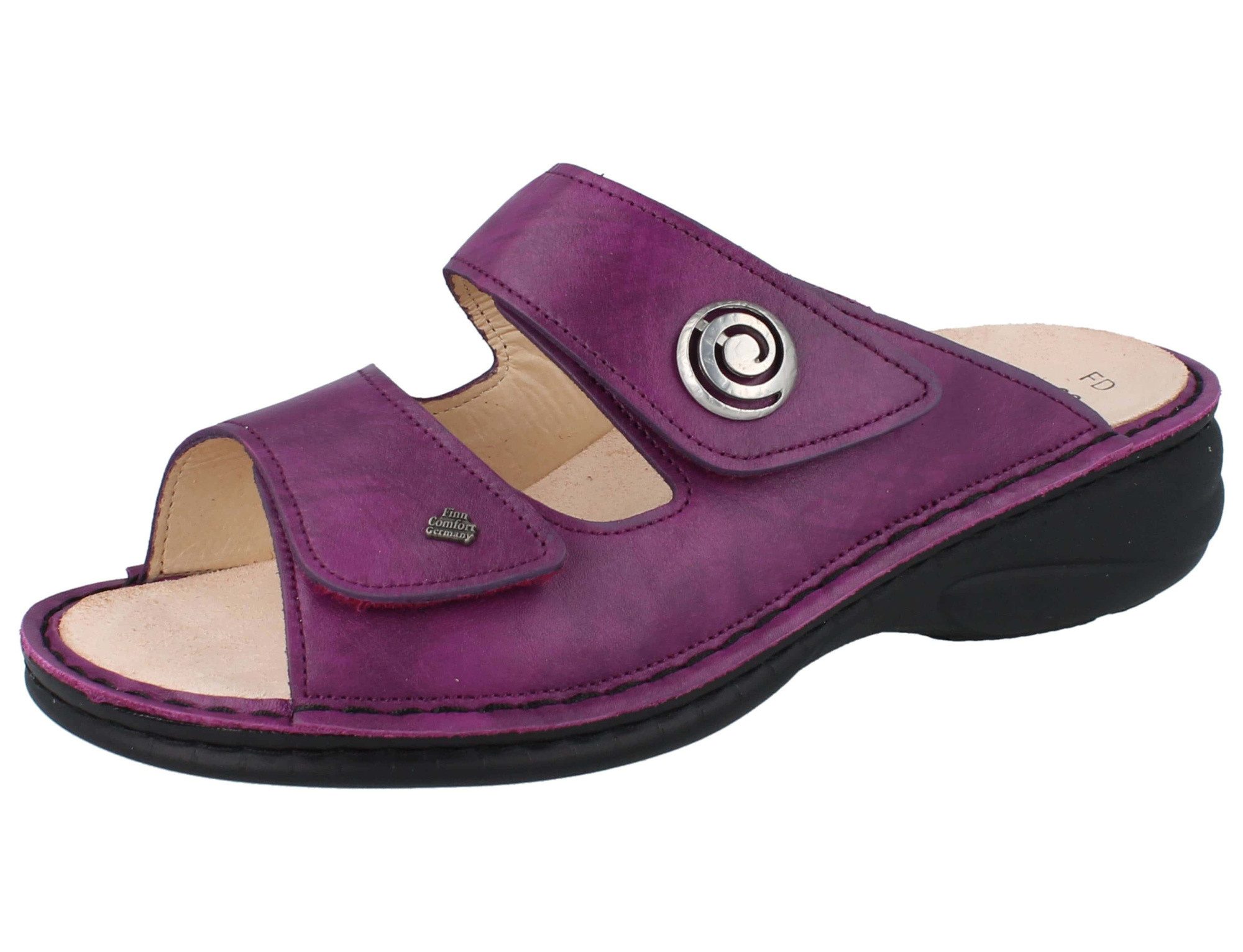 In einem trendigen lila Glattleder mit einem dunklen Sohlenrand als schönen Kontrast und mit einem Schmuckstein am oberen Klettverschlussriemen zeigt sich die bequeme Damenpantolette Colina der Schuhmarke FinnComfort.