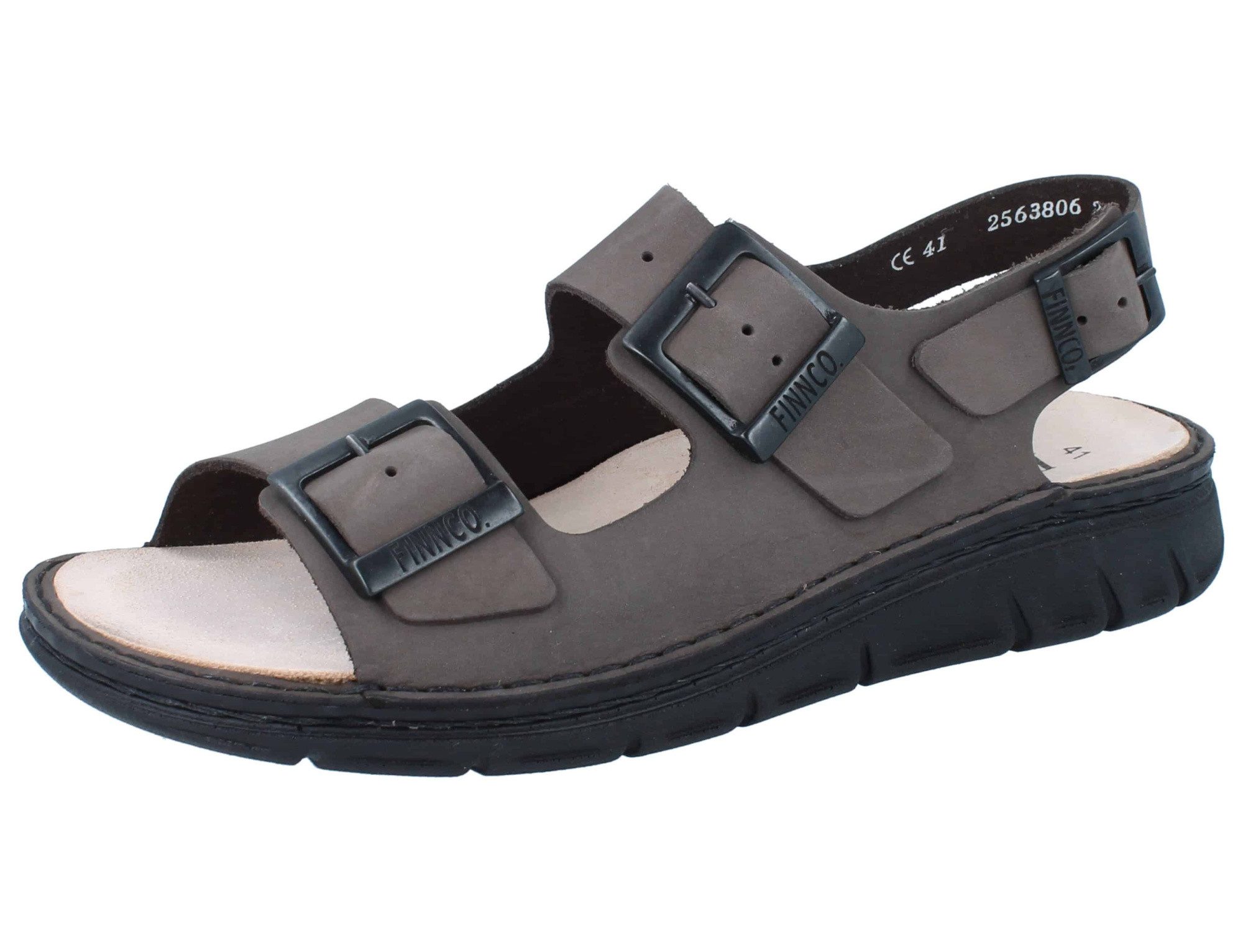Dieses neue Herrenmodell Nevis Soft der Schuhmarke FinnComfort ist eine bequeme Herrensandale aus grauem gefettetem Nubukleder.