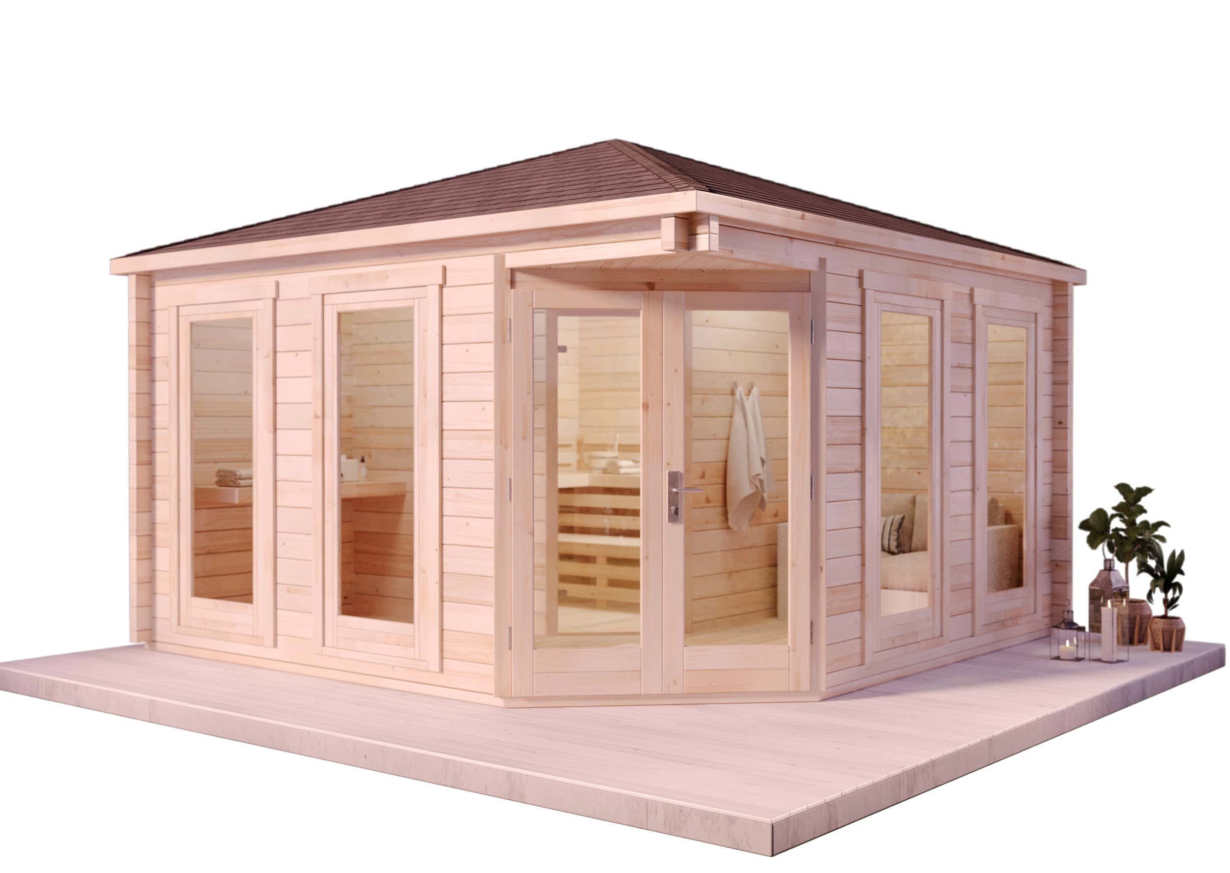 Ausstattung | Massivholzdach, Massivholzfußboden, Ofenschutzgitter, isolierte Saunadecke |
