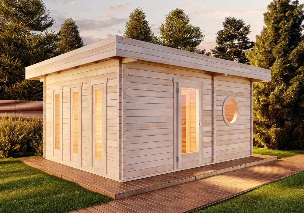 Ausstattung | Massivholzdach, Massivholzfußboden, Ofenschutzgitter, isolierte Saunadecke |