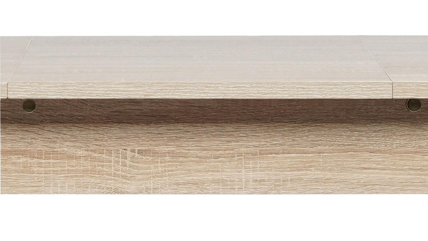 Der Esstisch Coburg ist in hellem Sonoma Eichenholzlook gestaltet und sorgt für Wohnlichkeit im Esszimmer. Damit man kulinarische Köstlichkeiten auch in einer größeren Gruppe genießen kann, lässt sich der Tisch von 140 cm Длина auf 180 cm erweitern. Insgesamt können 6 bis 8 Personen an diesem Esszimmertisch Platz nehmen. Durch die wasserabweisende und kratzfeste Melaminbeschichtung weist der Tisch Langlebigkeit auf und wird mit vier Metallwinkeln am Tischgestell stabilisiert. Außerdem schützen Bodengleiter an den Tischfüßen, den Fußboden vor unschönen Schrammen.