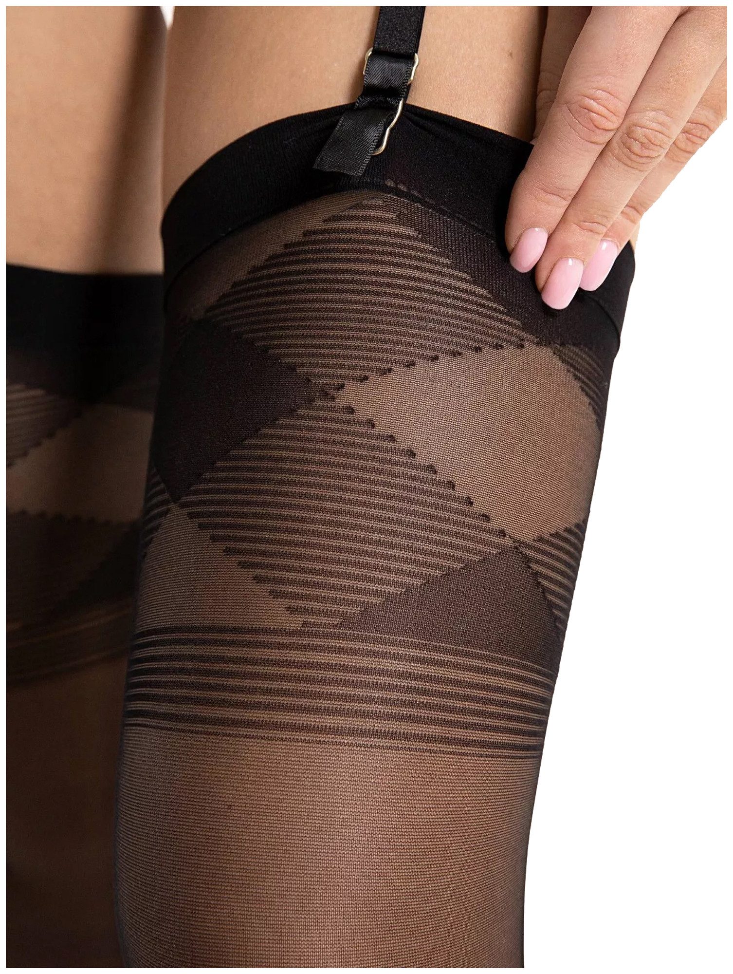 Elegante Strapsstrümpfe mit geometrischem Muster. Unsichtbar verstärkter Zehenbereich. Hergestellt in einer Flechttechnologie, die die Qualität und Haltbarkeit des Produkts erhöht.