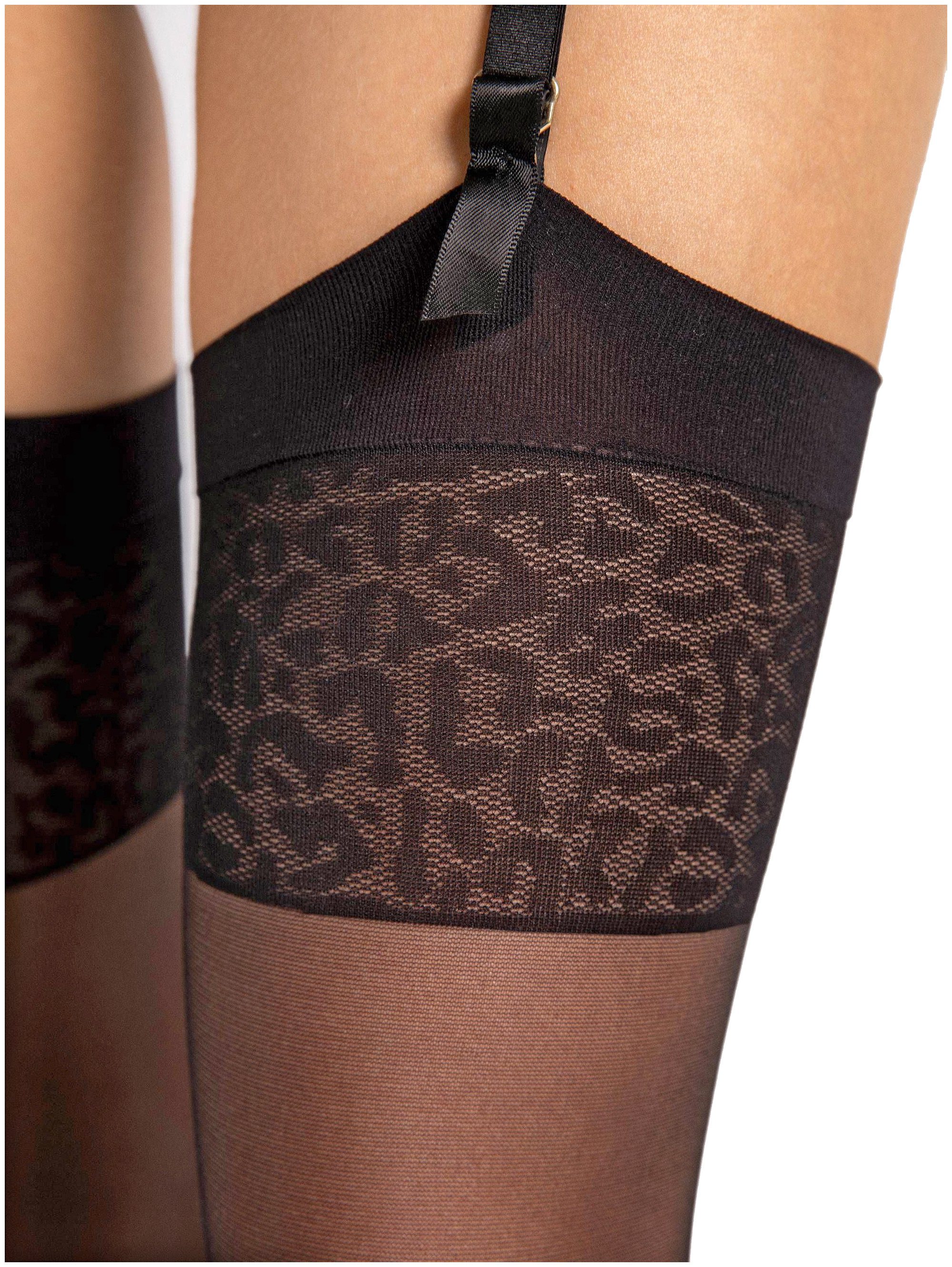 Wildheit des Herzens und der Natur vereint in einem auffälligen Modell mit Raubtiermuster. Die sinnlichen Strapsstrümpfe mit Leopardenflecken auf schwarzem Hintergrund direkt auf dem Strumpfband.