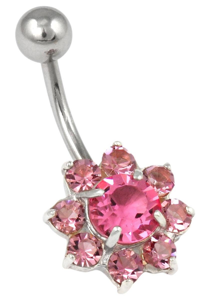Dieses verspielte Piercing fasziniert im hinreißend modernen Design und ist verziert mit glitzernden Kristallen. Die zarte, rosafarbene Blume setzt feminine Akzente.