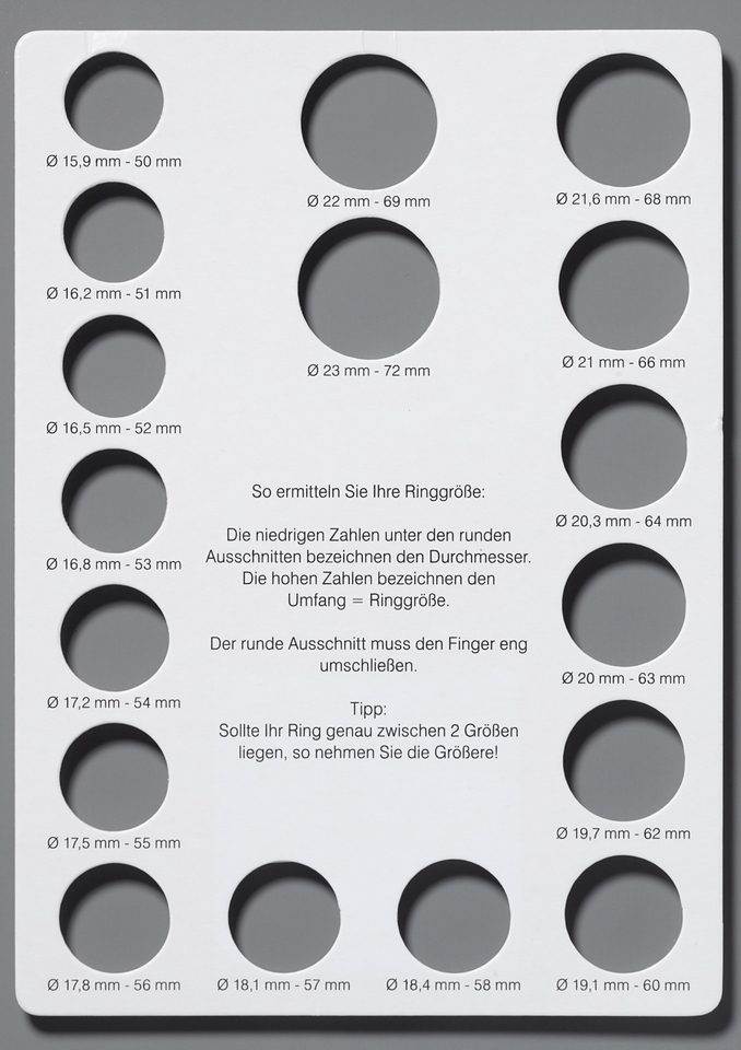 Artikelhinweise | Vor dem Kauf sollte auch noch bedacht werden, dass die Finger der rechten und der linken Hand bei den meisten Menschen unterschiedlich stark sind. Rechtshänder haben eine etwas kräftigere rechte Hand, für Linkshänder gilt dies natürlich für die linke Hand. Deshalb ist es wichtig sich vor dem Kauf zu überlegen, an welcher Hand Sie den Ring tragen möchten. Zudem sind die Finger bei Wärme und am Abend stärker, jedoch bei Kälte und am Morgen oft dünner. Diese Kriterien machen nicht immer eine ganze Ringgröße aus. Ebenso zeigen breite oder starke Ringe andere Trageeigenschaften, als schmale und dünne Ringe. Breite Ringen "saugen" sich stärker an, deshalb ist es empfehlenswert, dass breite Ringe direkt nach dem anlegen eher etwas locker sitzen sollten. Schmale Ringe weisen diese Eigenschaft nicht auf, sie sollten eher nicht so viel Spielraum beim Tragen aufweisen. Auch spielt die Verabeitung des Ringes eine wichtige Rolle, was den Tragekomfort angeht. Breite Ringe die rundherum die gleiche Breite aufweisen, fühlen sich getragen eher störend an als Ringe, deren Ringbreite sich in einem Verlauf verjüngt. Es gibt auch unterschiedliche Arten von Ringinnenschienen. Man kennt sie als glatt und eben verarbeitet, nach innen hohl werdend oder aber auch als bombiert. Bombiert bedeutet, dass der Ring eine bauchige Wölbung aufweist. Diese Wölbung erhöht den Tragekomfort des Ringes, Zur Ermittelung der richtigen Ringgröße wählen Sie entweder einen Referenzring - dieser sollte gleichmäßig rund und nicht verformt sein - und legen diesen auf die Ringschablone oder Sie stecken den Finger an dem der Ring getragen werden soll, direkt in die Ausstanzungen. Kleiner Tipp: Es ist einfacher, wenn man die Ringschablone zerschneidet. Ringmaßkarte. Welche Ringgrößen gibt es? Ermitteln Sie mit dieser Schablone Ihre passende Ringgröße. Sie haben die Wahl: Bestellen Sie sich klassisch die Ringmaßkarte oder drucken Sie sich die Ringmaßkarte aus. Unsere druckbare Ringmaßkarte finden Sie hier unter der Bezeichnung Спецификации товара (на немецком).pdf. Drucken Sie diese Seite auf DIN A4 aus. Wählen Sie vor dem Druck unter den Seiteneinstellungen keine Druckeinpassung, so dass die Seite in der Originalgröße gedruckt wird. Ob der Druck richtig erfolgt ist, können Sie anhand der Linie kontrollieren. Diese ist bei korrekter Druckeinstellung 10 cm lang. |
