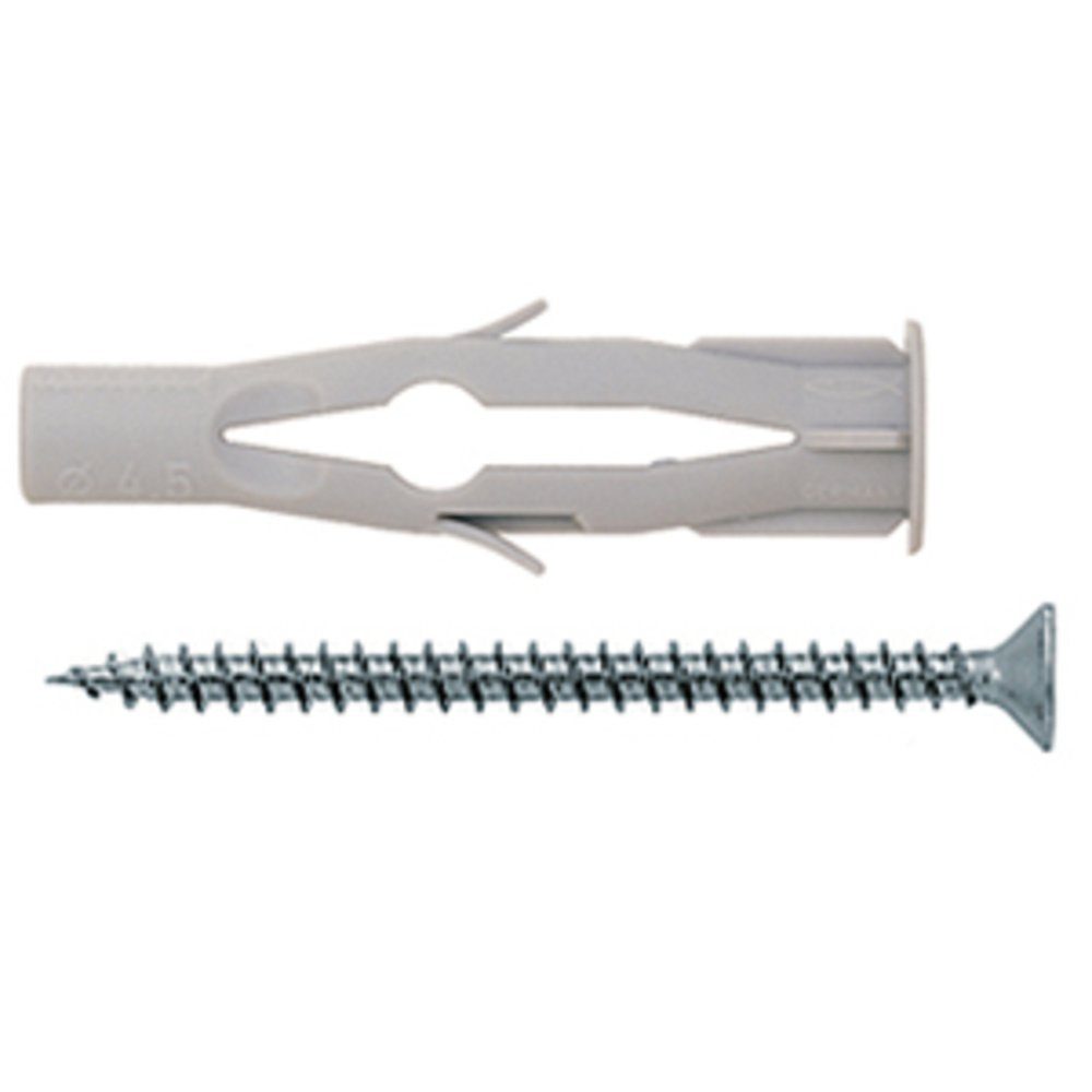 Kunststoff-Universaldübel aus Polyamid. Die Dübelgeometrie ermöglicht Reibschluss (Spreizen) in Vollbaustoffen und Formschluss (Ausknicken) in Lochsteinen oder Hohlwänden