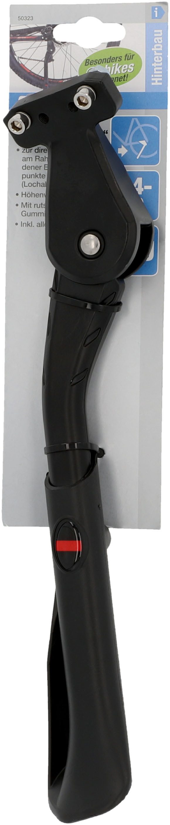 Mit seinem Gummifuß gibt der integrale Hinterbauständer von FISCHER dem Fahrrad einen sicheren Stand. Dieser Gummifuß sorgt einerseits für Rutschfestigkeit bei Nässe und vergrößert andererseits die Standfläche, was ein Umkippen verhindert. Dank dieser Eigenschaft bietet der Hinterbauständer von FISCHER auf jedem Untergrund einen sicheren Halt. Als Material kommt Aluminium zum Einsatz, was den Hinterbauständer zum einen robust und unempfindlich gegenüber äußeren Einflüssen macht. Dies trägt auch zur Langlebigkeit des Hinterbauständers von FISCHER bei. Zum anderen ist der Ständer dadurch auch besonders leicht. Insgesamt bringt der Hinterbauständer rund 1,3 kg auf die Waage. Dabei stellt der Fahrradständer eine Tragkraft von 35 kg bereit. Mit einer Schraubbefestigung wird der Ständer an der Kettenstrebe montiert. Всеs für die Installation benötigte Zubehör wie die Befestigungsschraube ist Teil des Lieferumfangs. Впередhin ist eine stufenlose Höhenverstellbarkeit möglich, sodass der Hinterbauständer von FISCHER flexibel zu Fahrrädern mit Rahmen in einem Größenbereich von 24 bis 29 Zoll passt und kompatibel zu Rädern mit Nabenschaltung ist.