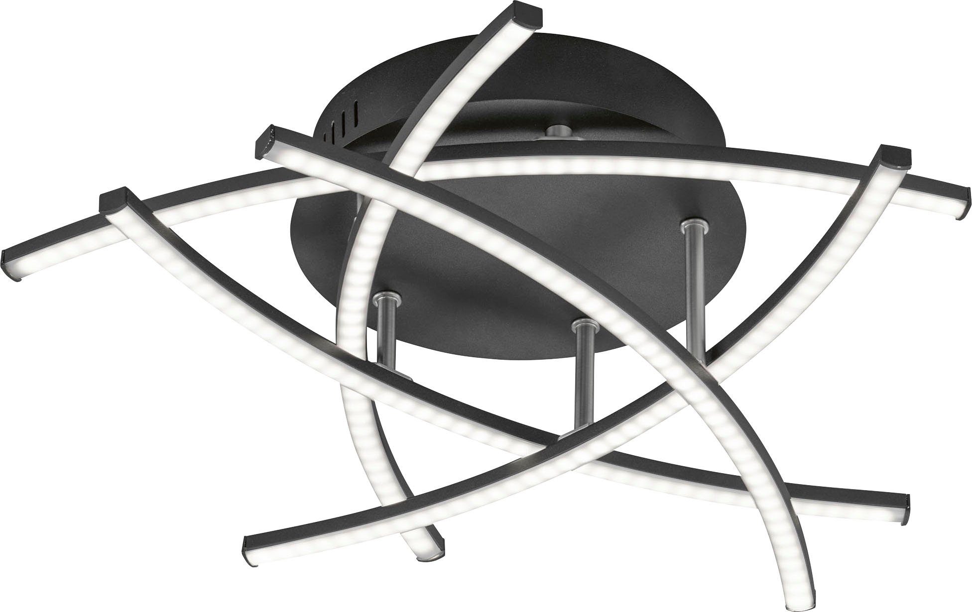 5-FLAMMIGE LEUCHTE IN MODERNSTEM DESIGN – Als echter Blickfang erweist sich die 5-flammige LED-Deckenleuchte Cross TW, die mit fünf ineinander- und übereinandergreifenden Armen eine bemerkenswert smarte Lichtverteilung erzeugt. Jeder der Arme, die jeweils als Kreissegmente ausgeformt sind, besetzt eine andere Ebene in der trotz der Vielzahl dieser Ebenen nur 16 cm flachen Leuchte. Die filigranen Lichtbögen scheinen sich an den Kreuzungspunkten die „Hände“ zu reichen. Das nach unten abgestrahlte Licht wird durch eine weiße Acrylblende homogenisiert. Die unterschiedlichen Lichtstimmungen (Weißtöne), die sich einstellen lassen, machen die LED-Deckenleuchte Cross TW nicht nur für das Wohnzimmer zu einer geeigneten Deckenleuchte, sondern prädestinieren sie auch für den Gebrauch in Schlafzimmer, Arbeitszimmer, Kinderzimmer und anderen Räumen. FLACH, ABER HOCHGRADIG 3-DIMENSIONAL – Die nicht einmal 1 kg schwere LED-Deckenleuchte hat einen Durchmesser von 50 cm. LICHTMODULATION – Jeder Arm ist mit LED-Modulen a 4 W Leistungsaufnahme bestückt und kann einen Lichtstrom von bis zu 480 Lumen liefern. Durch den Einsatz unterschiedlicher Weißtöne für die einzelnen LEDs lässt sich die Farbtemperatur stufenlos regeln. Verfügbar sind Farbtemperaturen zwischen 4000K (neutralweiß) und 2700K (warmweiß). Die Farbtemperatur wird über eine mitgelieferte Fernbedienung gesteuert.