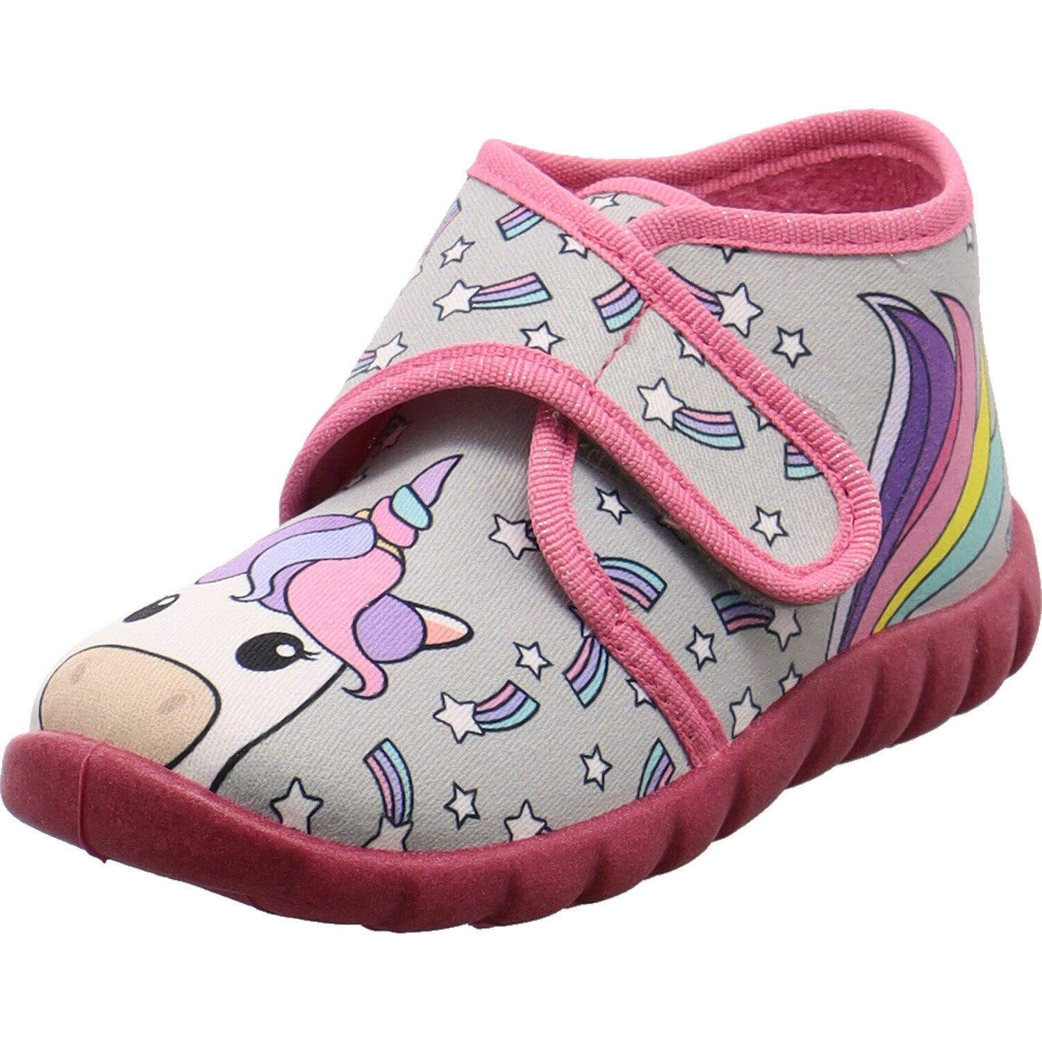Dieser Kinder Klett Hausschuh Flexi von Fischer Markenschuh ist perfekt für kleine Mädchen, die zu Hause oder im Kindergarten toben und herumtollen wollen. Der Schuh ist aus strapazierfähigem Textil in Grau gefertigt. Absoluter Hingucker ist dabei das Einhorn auf dem Blatt und der Schweif an der Seite in Bunt. Kleine Sternschnuppen und die Textil Kanten in Rosa mit Glitzer Effekt runden das verspielte Design perfekt ab. Er ist mit einem Frottee Innenfutter versehen und sehr leicht. Zudem lässt er sich durch den seitlichen Klettverschluss leicht an- und ausziehen, was beim Spielen oft von Vorteil ist. Die stabile Sohle ist leicht profiliert und dennoch flexibel. Die Perforierung sorgt für eine optimale Belüftung.