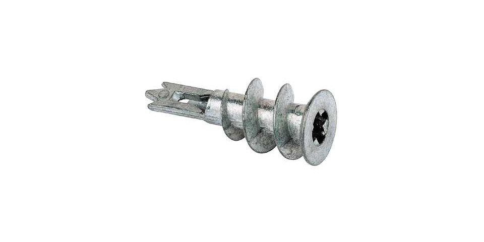 Der Fischer Gipskartondübel GKM SK ist aus Metall gefertigt. Der Dübel wird in der Vorsteckmontage mit einem Akku-Schrauber oder von Hand oberflächenbündig in Gipskartonplatten eingedreht. Bei einfach beplankten Gipskartonplatten ist kein Vorbohren notwendig. Bei Gipsfaserplatten und doppelt beplankten Gipskartonplatten mit Bohrer Ø 8 mm vorbohren.
