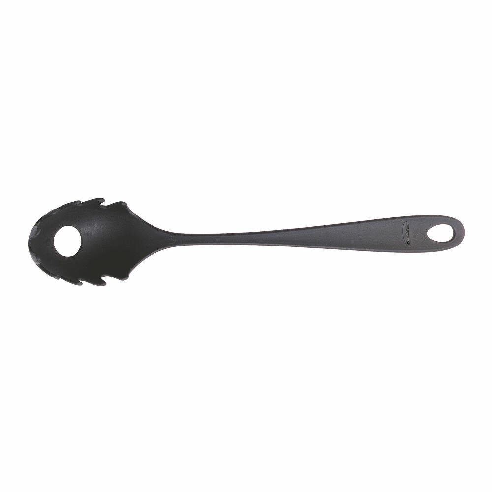 Mit diesem Nudellöffel lassen sich besonders Spaghetti sehr leicht portionieren. Das Wasser läuft durchs Loch und die Nudeln gehen direkt auf den Teller. Aber auch wenn man das Wasser aus dem Topf nicht abgießen möchte, hat man die Nudeln mit diesem Löffel schnell aus dem Topf geholt. Der Kunststoff ist hochwertig und geruchsneutral. Die Farbe schwarz passt sehr gut zu einem schwarzen Pfannenwender, den ich schon hatte.