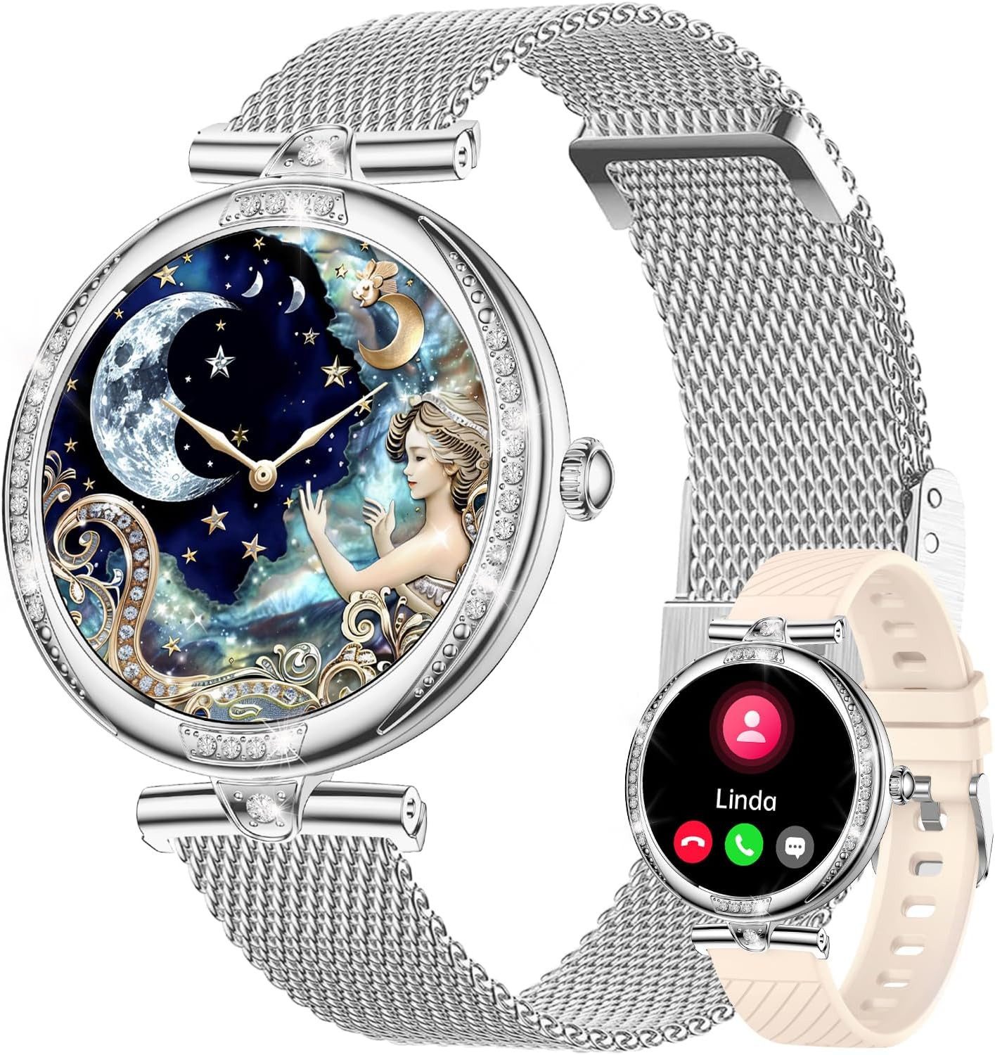 Die Damen-Smartwatch verfügt über ein 1,19 Zoll großes HD-AMOLED-Display mit einstellbarer Helligkeit und Bildschirmabschaltzeit. Auch bei direkter Sonneneinstrahlung bleibt die Anzeige klar und kontrastreich. Über die Fitcloudpro-App stehen über 100 individuell wählbare Zifferblätter zur Verfügung, zusätzlich kann ein eigenes Foto – z. B. von Familie oder Haustieren – als Hintergrund genutzt werden.