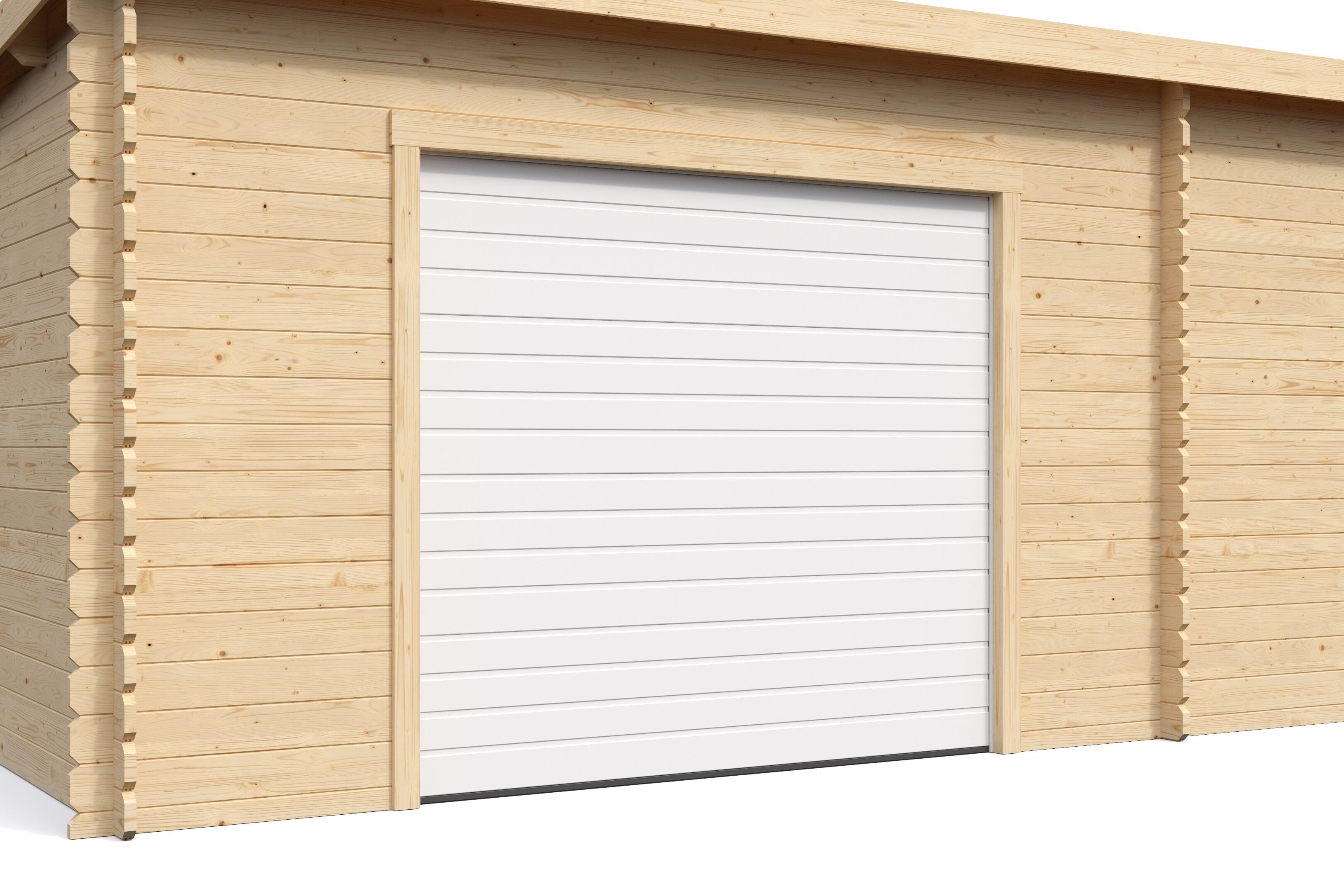 Holzgarage Modell Freiburg 44 * massive 44mm starke Wandbohlen aus nordischer Fichte naturbelassen mit 4-fach Eckausfräsung * Massivholz-Dach aus 18mm starken Nut- und Federbrettern * extra starke Dachkonstruktion auch für höhere Schnee- und Windlastzonen geeignet * Massivholz-Fußboden aus 18mm starken Nut- und Federbrettern (nur im Abstellraum) * imprägnierte Fundamentbalken als Unterkonstruktion * 1x hochwertiges 2-flg. Holzgaragentor * eine Notentriegelung gehört nicht zum Lieferumfang des Sektionaltores * 1x extra hohe Doppeltür mit Leimholzrahmen (200 cm Durchgangshöhe) * hochwertige Edelstahl Türdrücker mit PZ-Schloß inkl. 3 Schlüsseln * hochwertige Edelstahltürschwelle für den leichten Einstieg * 1x hochwertiges Doppelfenster mit Dreh/Kipp-Funktion * Verglasung der Fenster & Türen aus Isolierglas * Gummidichtungen bei Türen und Fenstern * Sturm- und Windsicherung durch innenliegende Gewindestangen * hochwertige Sichtschutz-Gitterwände * hochwertiges Montagematerial & Aufbauplan * ohne Dacheindeckung ( optional als Zubehör erhältlich)