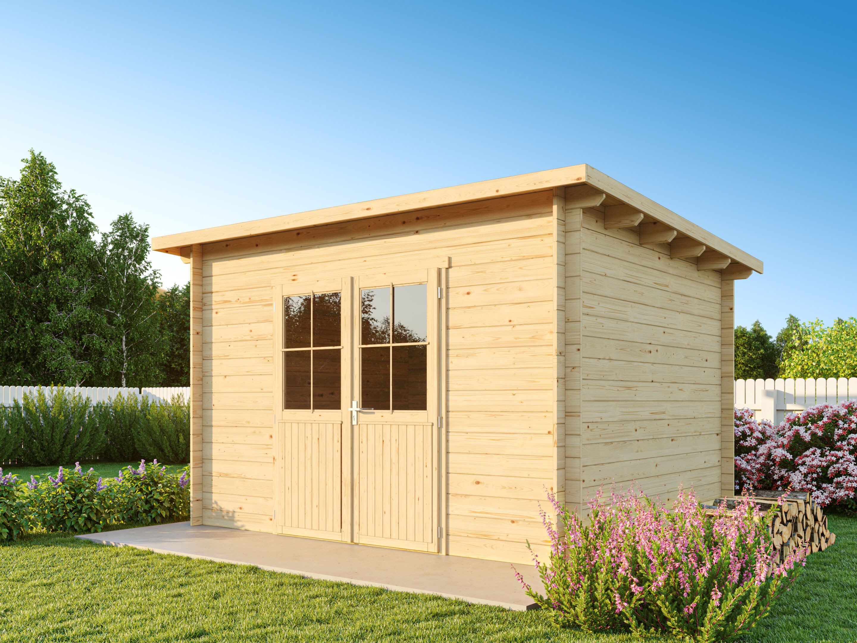 Pultdach Gartenhaus Modell Ezra 4D * massive 28mm starke Wandbohlen aus nordischer Fichte naturbelassen mit 4-fach Eckausfräsung * Massivholz-Dach aus Nut- und Federbrettern * 1x hochwertige Doppeltür mit Leimholzrahmen * hochwertiger Türdrücker mit PZ-Schloß inkl. 3 Schlüsseln * hochwertige Edelstahltürschwelle für den leichten Einstieg * Verglasung der Türen aus Echtglas * patentierte Windsicherung auf der Innenseite * hochwertiges Montagematerial & Aufbauplan * ohne Dacheindeckung ( optional als Zubehör erhältlich) * ohne Fußboden (optional als Zubehör erhältlich)