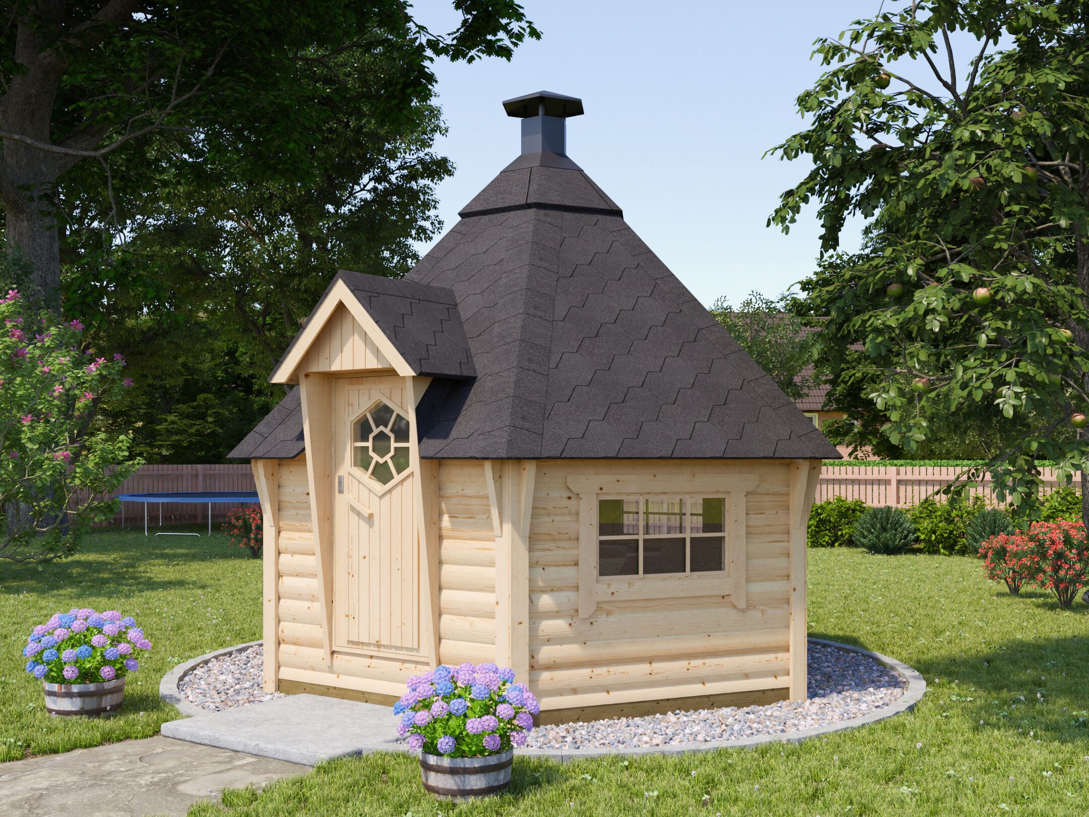 Fjordholz 6-Eck Grillkota Modell Nils 9m² * massive 45mm starke vorgefertigte Wandelemente aus nordischer Fichte naturbelassen * Massivholz-Dach aus 18mm starken vorgefertigten Dachelementen * Dachelemente werden bereits im Werk mit schwarzen Hexagonal Dachschindeln vorgeschindelt * extra starke Dachkonstruktion auch für höhere Schnee- und Windlastzonen geeignet * vorgefertigte Massivholz-Fußbodenelemente aus 28mm starken Bodenbrettern (Gitterelemente) * imprägnierte Fundamentbalken als Unterkonstruktion * 1x hochwertige abschließbare Eingangstür mit Sichtfenster * 3x hochwertige Fenster (1x Kipp-Fenster,2x feststehend) * Verglasung der Tür und Fenster aus Isoglas * hochwertiger 6-Eck Grill mit Tischplatten und diversen Grillrosten * hochwertige Rauchabzuganlage inkl. Schornstein * 5x hochwertige Sitzbänke im Grillbreich * hochwertiges Montagematerial & Aufbauplan * einfache und schnelle Montage durch vorgefertigte Elementbauweise