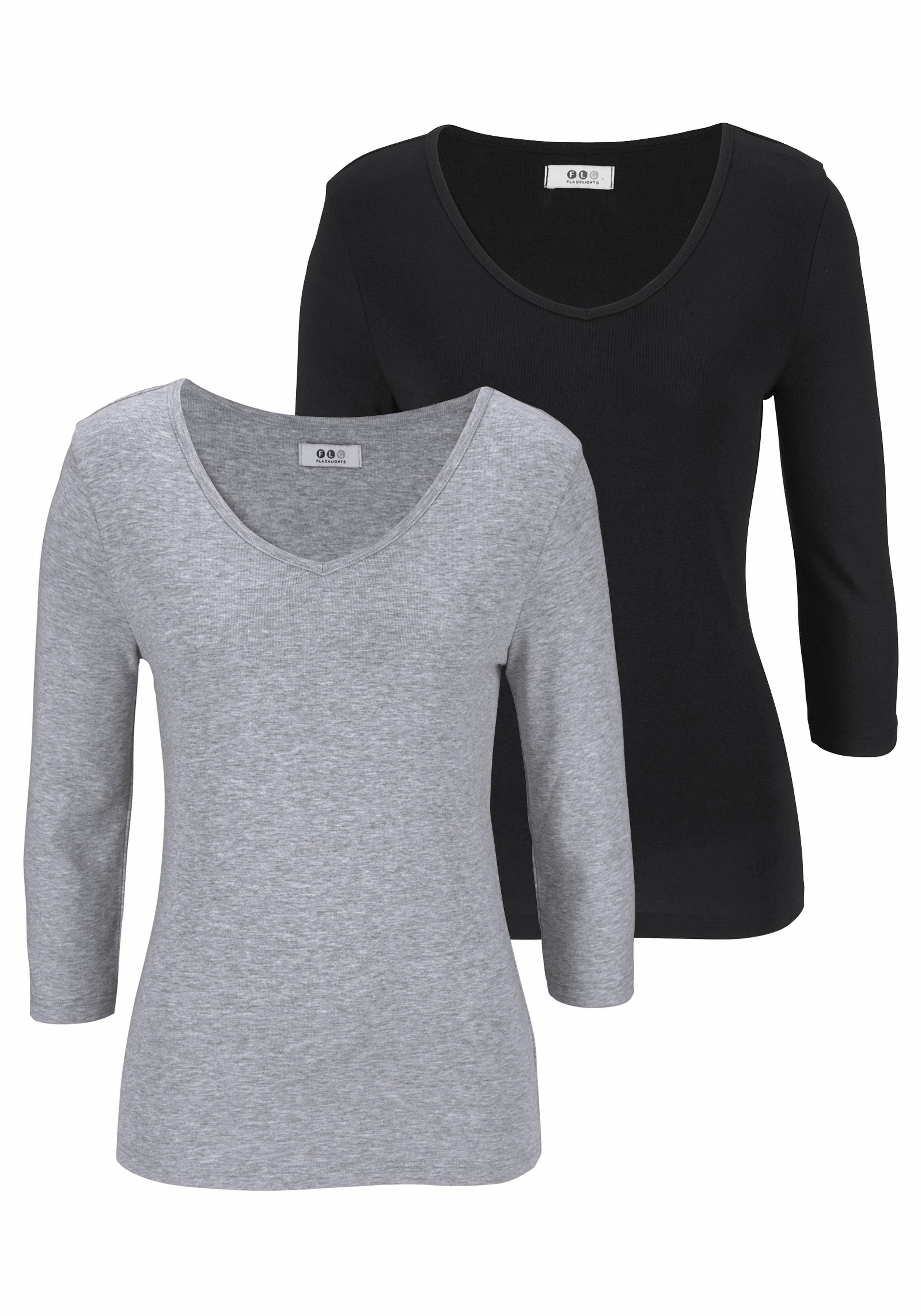 Schau dir das V-Shirt von Flashlights mal genauer an. Dieses Shirt hat einen V-Ausschnitt mit eingefasster Kante und ist sehr figurbetont geschnitten, sodass deine Silhouette schön in Szene gesetzt wird.