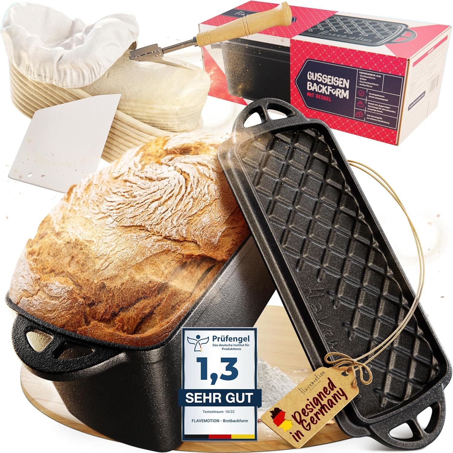 Flavemotion Brotbackform mit Deckel - Gärkörbchen, Bäckermesser, Teigkarte, Starter-Rezept, Kastenform, Gusseisen Topf, Auflaufform
