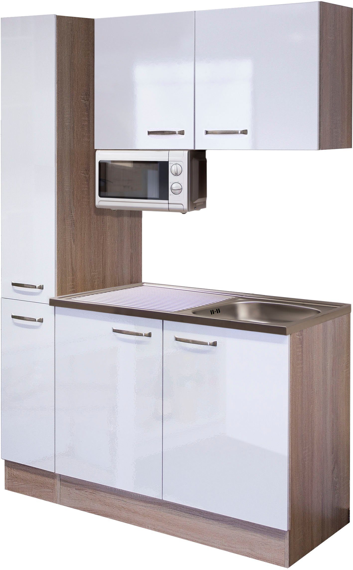 Ausstattung | Einlegeböden höhenverstellbar Metallgriffe Seitenverkehrt stellbar Sockelhöhe nicht verstellbar inkl. Edelstahl-Auflagespüle, mit Abtropffläche mit E-Geräten weitere Informationen zu Elektrogeräten: siehe Спецификации товара (на немецком) |