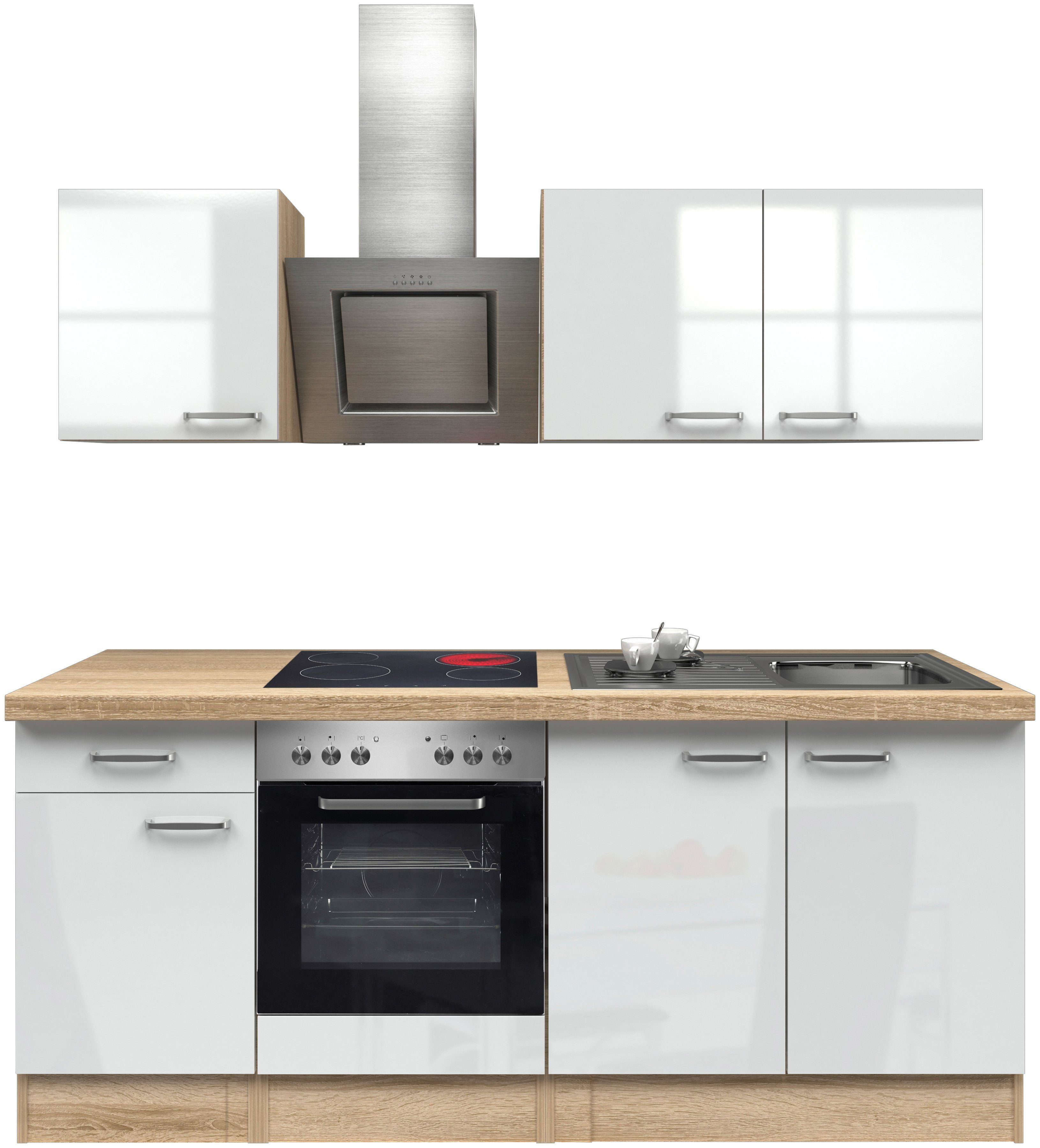 Set beinhaltet | Produktdetails - Gesamtbreite: 210 cm Serienname: Florenz Türanschlag: beliebig Frontdekor: eichefarben sonoma, weiß glanz Frontmaterial: Holzwerkstoff melaminbeschichtet Frontstruktur: matt, hochglänzend Korpusdekor: eichefarben sonoma Korpusmaterial: Holzwerkstoff melaminbeschichtet Arbeitsplattendekor: eichefarben sonoma Griffe: Bügelgriff edelstahlfarbig Sockelhöhe: 13.6 cm Sockel nicht verstellbar Möbelausstattung Hängeschrank Maße (B/T/H): 50/32/55 cm Anzahl Türen: 1 Anzahl Einlegeböden: 1 Hängeschrank Maße (B/T/H): 100/32/55 cm Anzahl Türen: 2 Anzahl Einlegeböden: 1 Unterschrank Maße (B/T/H): 50/57/82 cm Anzahl Türen: 1 Anzahl Schubladen: 1 Schubkasteninnenmaß (B/T/H): 43,6/40/7,5 cm Anzahl Einlegeböden: 1 Spülenschrank Maße (B/T/H): 100/57/82 cm Anzahl Türen: 2 Spüle: Edelstahlspüle Herdumbauschrank Maße (B/T/H): 60/57/86 cm Arbeitsplatte Maße (L/B/H): 210/60/3,8 cm |