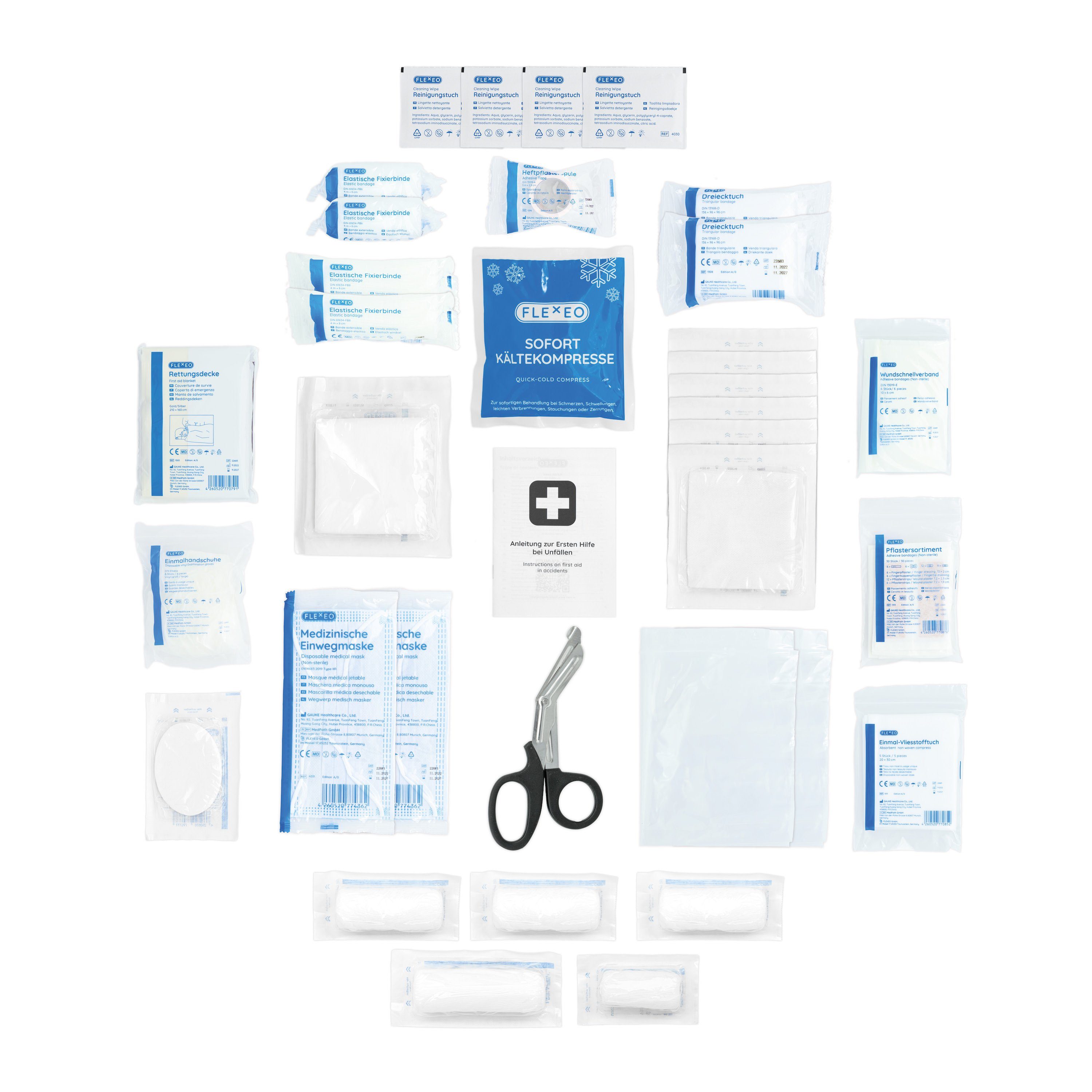 Set beinhaltet | 1 x Heftpflasterspule DIN 13 019-A (5 m x 2,5 cm) 12 x Wundschnellverband DIN 13 019-E (10 cm x 6 cm) 6 x Fingerkuppenverband 6 x Fingerverband (120 mm x 20 mm) 6 x Pflasterstrip (19 mm x 72 mm) 12 x Pflasterstrip (25 mm x 72 mm) 1 x Verbandpäckchen DIN 13 151-K 3 x Verbandpäckchen DIN 13 151-M 1 x Verbandpäckchen DIN 13 151-G 1 x Verbandtuch DIN 13 152-A 6 x Kompresse (100 mm x 100 mm) 2 x Augenkompresse 1 x Kälte-Sofortkompresse 1 x Rettungsdecke gold/silber (min. 2100 mm x 1600 mm) 2 x Fixierbinde DIN 61 634-FB 8 (4 m x 8 cm) 2 x Fixierbinde DIN 61634-FB 6 (4 m x 6 cm) 2 x Dreiecktuch DIN 13 168-D 1 x Schere DIN 58 279-B 190 2 x Folienbeutel 5 x Vliesstofftuch 4 x Einmalhandschuhe DIN EN 455 4 x Feuchttücher 2 x Gesichtsmaske DIN EN 14683 1 x Erste-Hilfe-Broschüre 1 x Inhaltsverzeichnis |