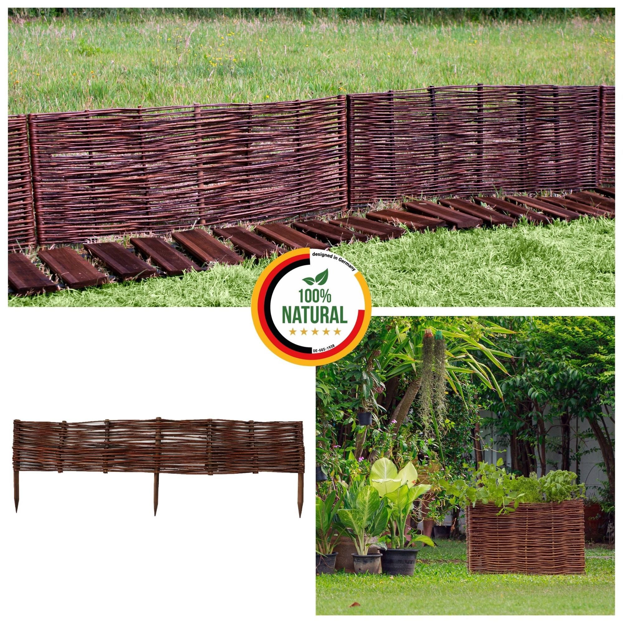 Die flexiblen Weidengeflechtzäune eignen sich hervorragend als Beetabtrennung, Rasenkante, Zaunelement, Gartenzaun, Holzzaun oder Terrassenzaun. Dank robuster Holzpfosten sind sie einfach zu montieren und besonders langlebig. Unsere Weiden-Beetumrandung sorgt für eine ordentliche Struktur in Ihrem Garten und verhindert, dass Pflanzen sich unkontrolliert ausbreiten.