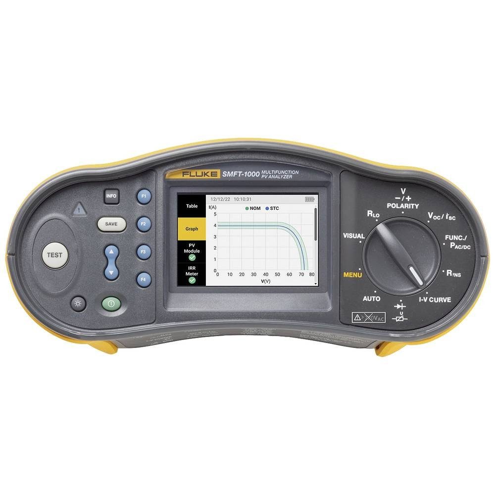 Prüfen Sie mit dem multifunktionalen PV-Leistungsanalysator Fluke SMFT-1000/PRO, ob PV-Anlagen optimale Leistung liefern und sicher arbeiten. Der SMFT-1000/PRO wurde für PV-Experten entwickelt, die Systeme mit bis zu 1000 V DC installieren, in Betrieb nehmen und instand halten. Er bietet für PV-Anlagen eine Komplettlösung, die die Forderungen der Norm IEC 62446-1 erfüllt. Messdaten von Installations- und Inbetriebnahmeprüfungen an Solaranlagen können mit der Fluke TruTest™ Software problemlos importiert, organisiert und analysiert werden. So können mühelos Berichte erstellt werden, ohne dass ein Laptop an den Standort mitgenommen werden muss. Das SMFT-1000/PRO enthält außerdem die Advanced TruTest™ Software und den Messleitungssatz für die MC4-Solarstrommesszange..