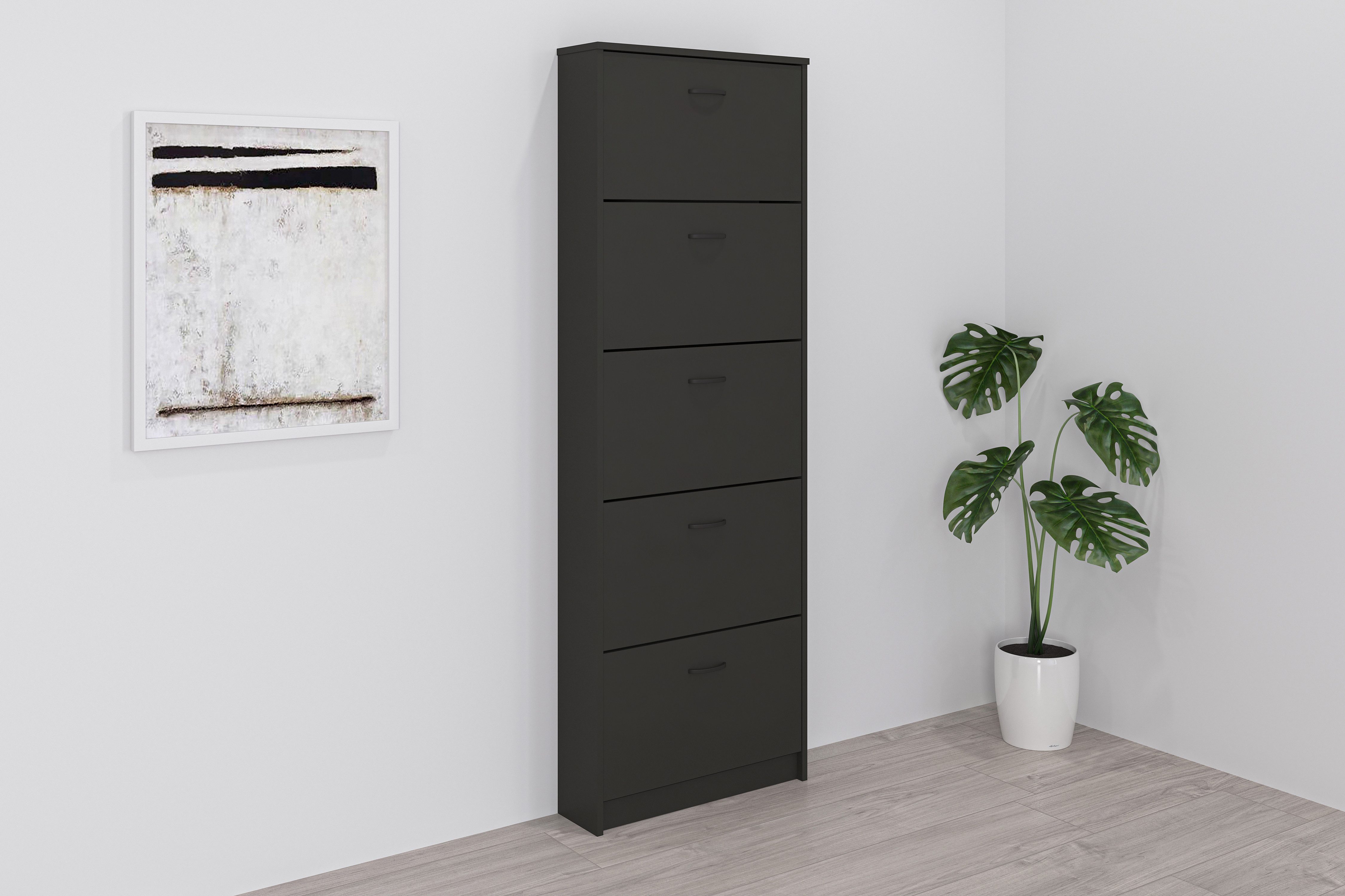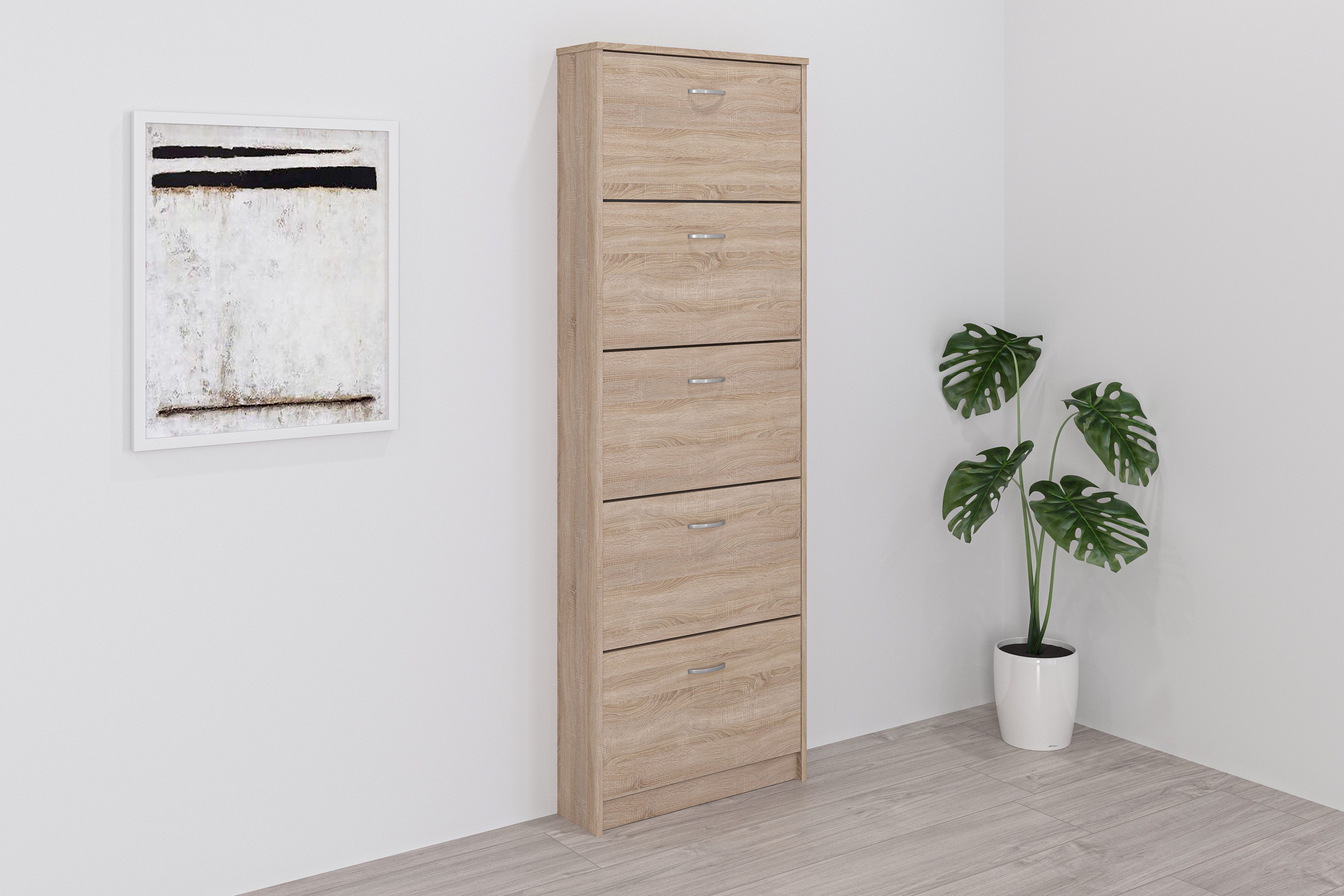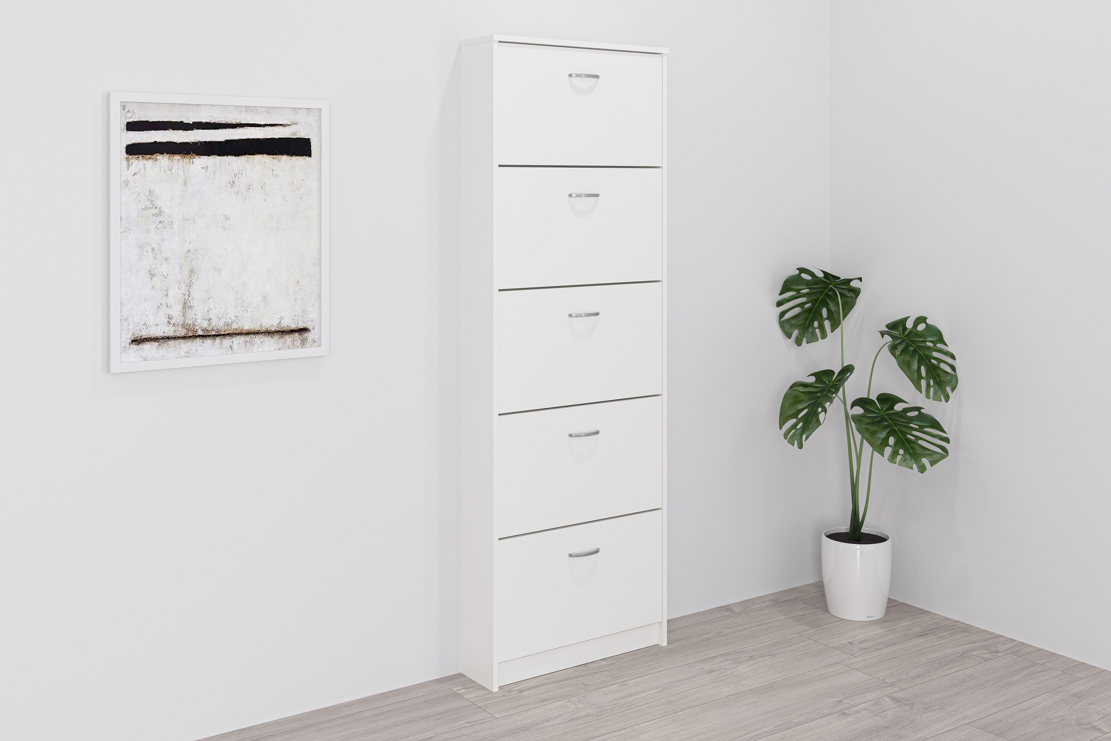 Vereint schöne Optik mit praktischer Funktion — der Schuhschrank »Step 5« von FMD.