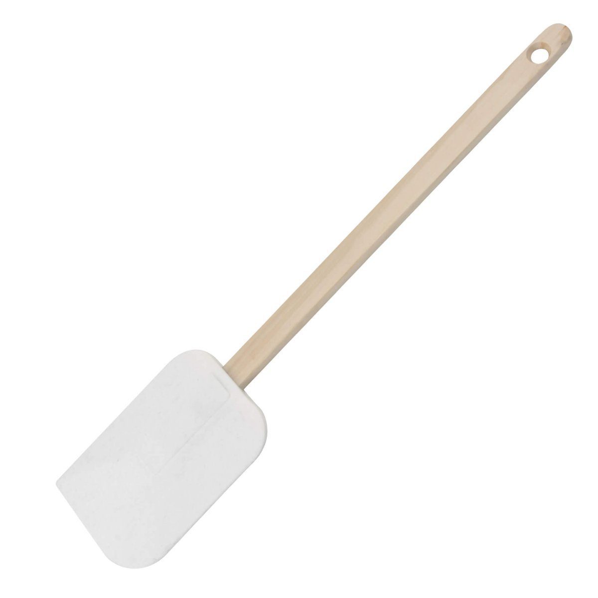 Der Teigschaber mit hellem Holzgriff und Funktionsteil aus weißem Kunststoff (100% TPO) von FMprofessional ist der ideale Küchenhelfer zum Verstreichen und Ausschaben von Teig und Crème in Kuchenformen oder Rührschüsseln. Mit einer Длина von circa 46,5 Zentimetern erreicht er mühelos den Schüsselboden. Die abgerundeten Kanten des Schabers passen sich problemlos den Rundungen der Teigschüssel an und sorgen dafür, dass dieser restlos aus der Schüssel geschabt wird. Die gerade geformte Seite des Schabers dient zum Glattstreichen des Teiges in der Backform. Der Teigschaber lässt sich platzsparend verstauen und kann bei Bedarf an der Öse aufgehängt werden. Nach dem Gebrauch kann er ganz einfach mit der Hand gereinigt werden.