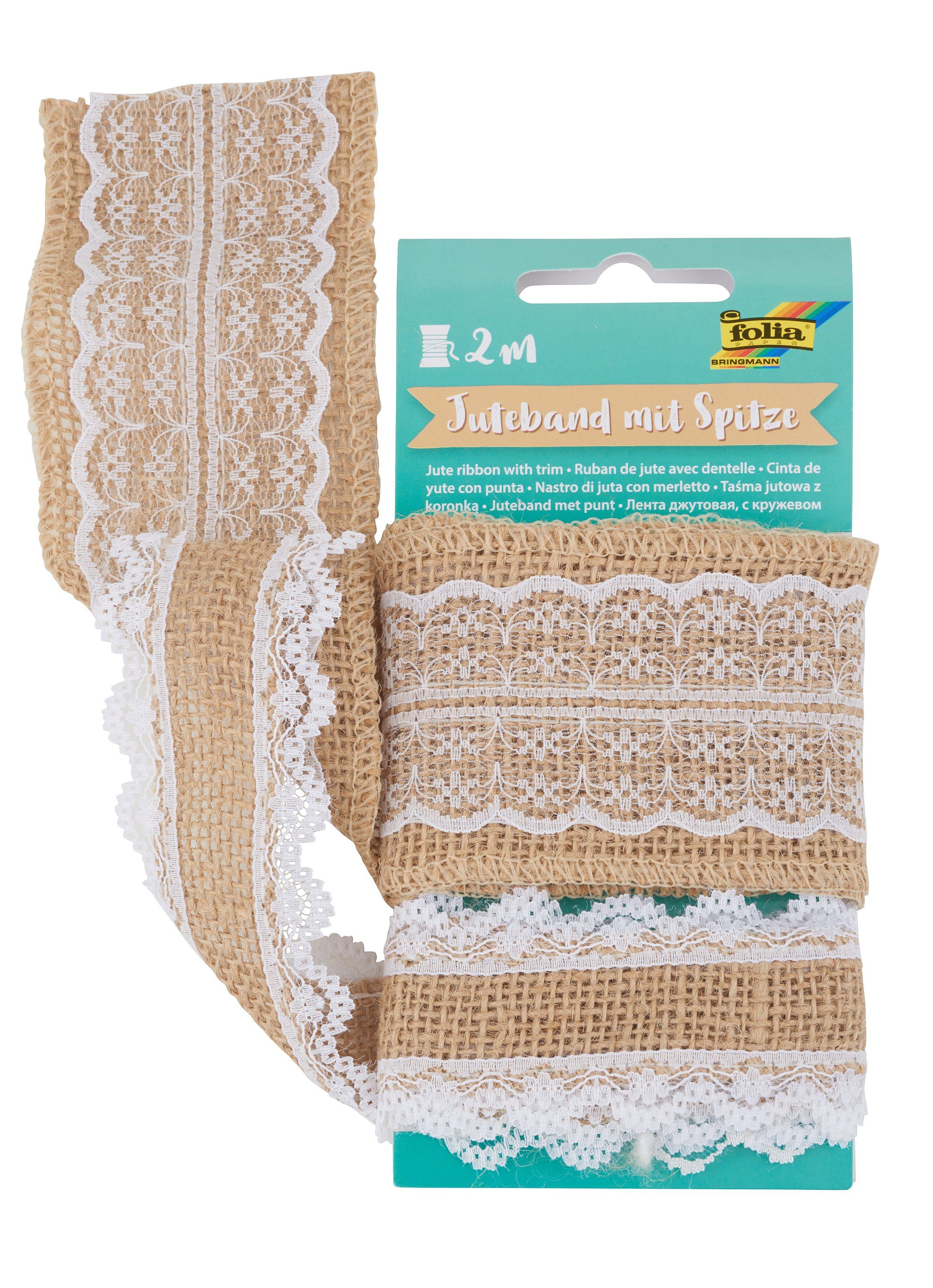 Dieses schöne Juteband mit Spitze kommt in 2 Ausführungen: Mit einer Breite von 4 cm und einer Breite von 6,5 cm. Das Band besteht aus 100 % Jute, die Spitze aus 100 % Polyester.