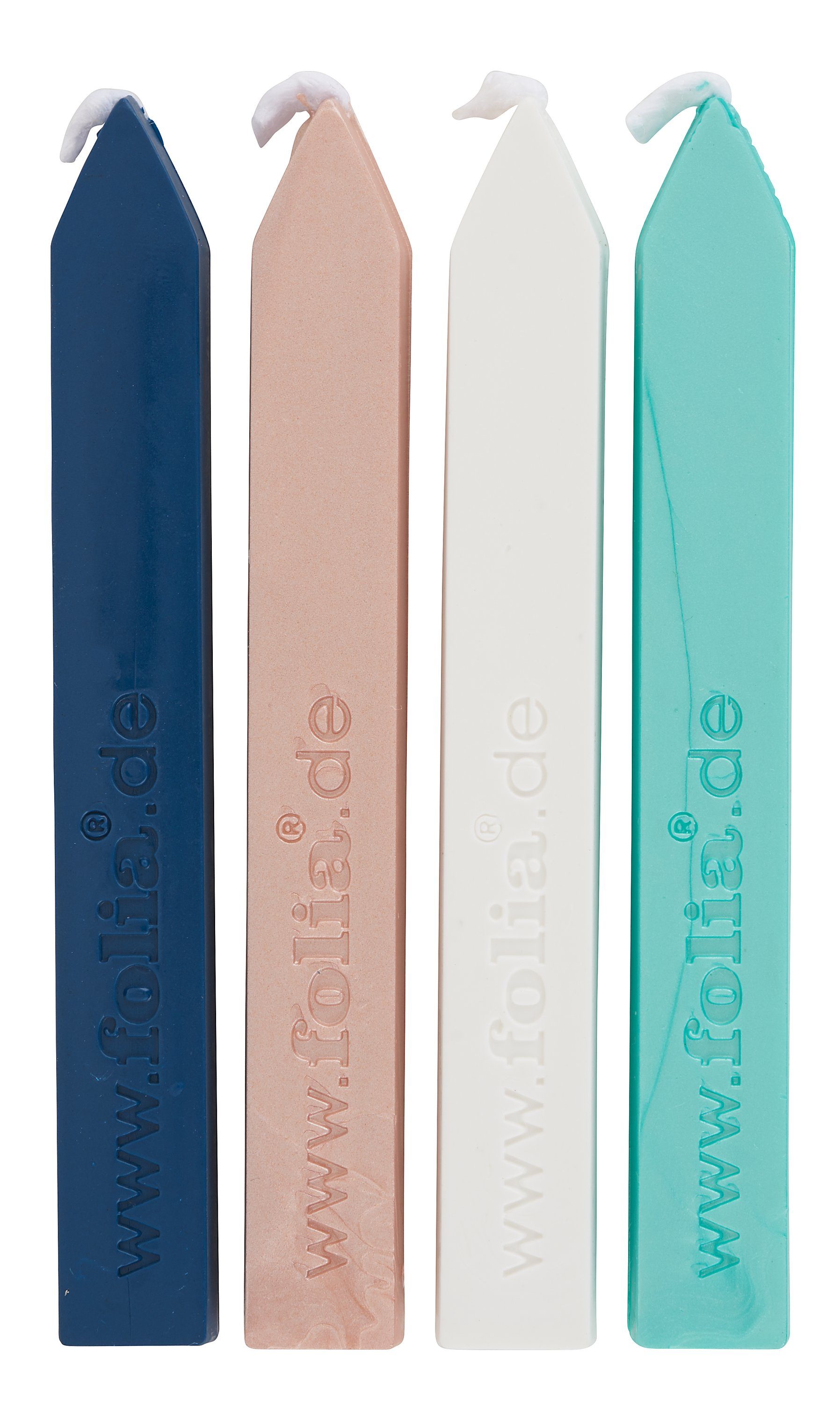Siegelwachs in zwei Вариантыn mit je vier Farben. Siegelwachs 'Style' in den Farben Marine, Rosé, Weiß und Mint-Metallic und Siegelwachs 'Classic' mit den Farben Gold, Silber und zweimal Rot. Zum Verzieren von Karten, Briefumschläge und Einladungen zur Hochzeit, Taufe und Geburtstag oder Geschenkverpackungen und Geschenkanhänger mit einem Siegelmotiv.