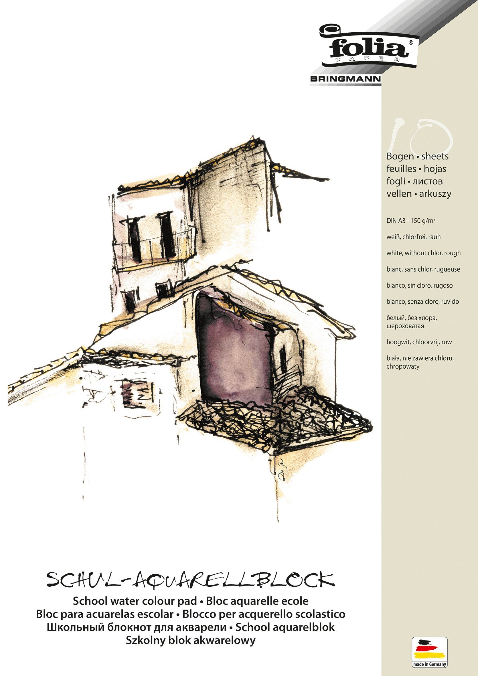 Ein Schul-Aquarellblock mit einem Gewicht von 150 g/m². Das Format ist A3 und Sie erhalten 10 Blatt chlorfreies und raues Papier. Toll für Aquarellmalerei in Schule und Hobby.