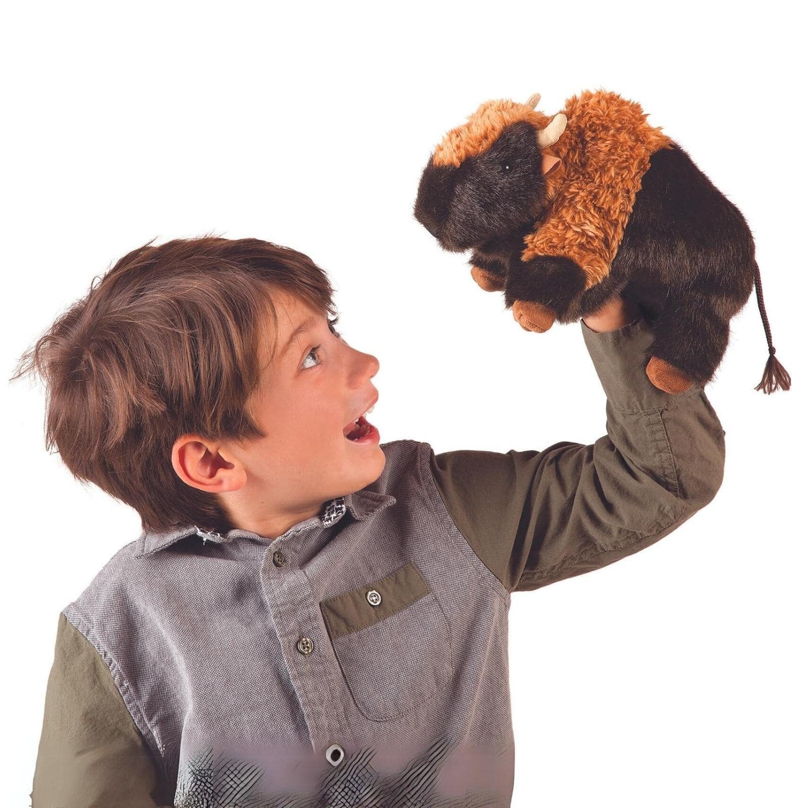 Erleben Sie Abenteuer in der Wildnis mit unserer Folkmanis kleinen Bison Handpuppe! Mit einem beweglichen Maul und Vorderbeinen können Sie diese majestätischen Tiere zum Leben erwecken und Ihrer Fantasie freien Lauf lassen. Diese Handpuppe bietet endlose Spielmöglichkeiten und regt die Vorstellungskraft an. Ob beim Erzählen von Geschichten oder beim Spielen, das kleine Bison wird zum treuen Begleiter und bringt die Freiheit der Wildnis in Ihre Zuhause.