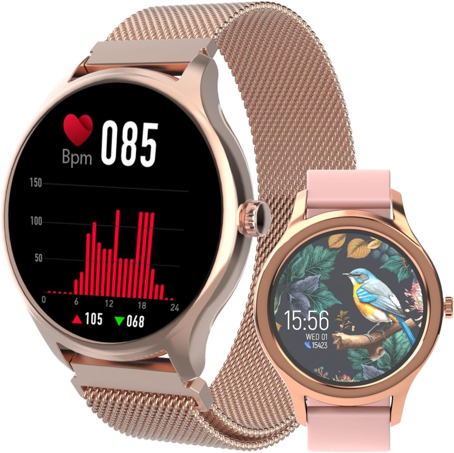Die Damen Smartwatch überzeugt durch ein schlankes Gehäuse und ein stilvolles Armband. Dank wechselbarer Silikonbänder passt sie sich verschiedenen Outfits flexibel an.