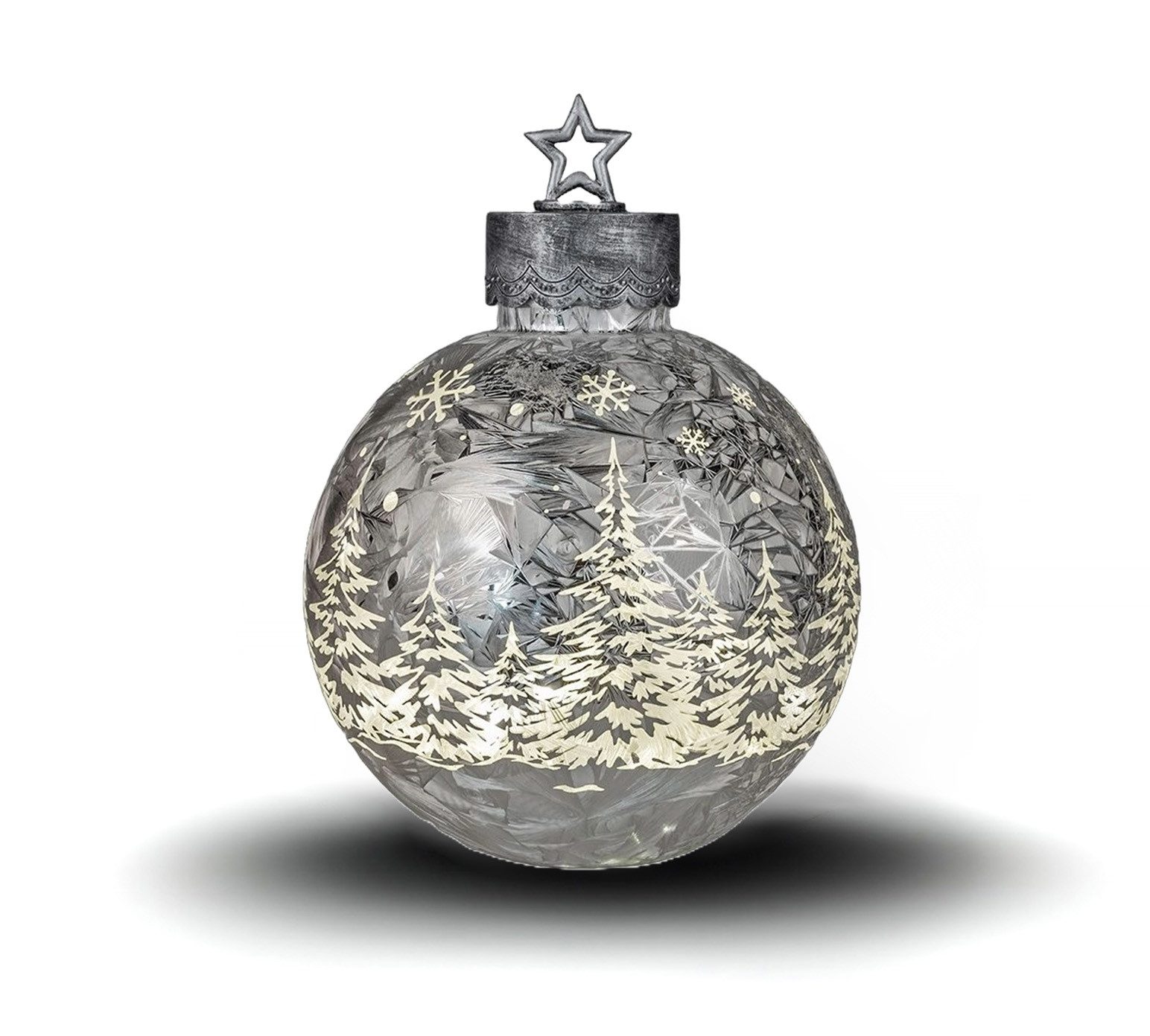 Verleihen Sie Ihrem Zuhause eine festliche Atmosphäre mit der Deko-Kugel Silber-Frosty mit LED-Licht und Timer. Diese elegante Dekoration kombiniert eine silberne Frostoptik mit einem winterlichen Design und einem aufgesetzten Stern, um eine bezaubernde Weihnachtsstimmung zu schaffen. Die Kugel besteht aus hochwertigem Farbglas und misst eine Höhe von 32 cm, was sie zu einem idealen Blickfang auf Tischen, Regalen oder Fensterbänken macht.